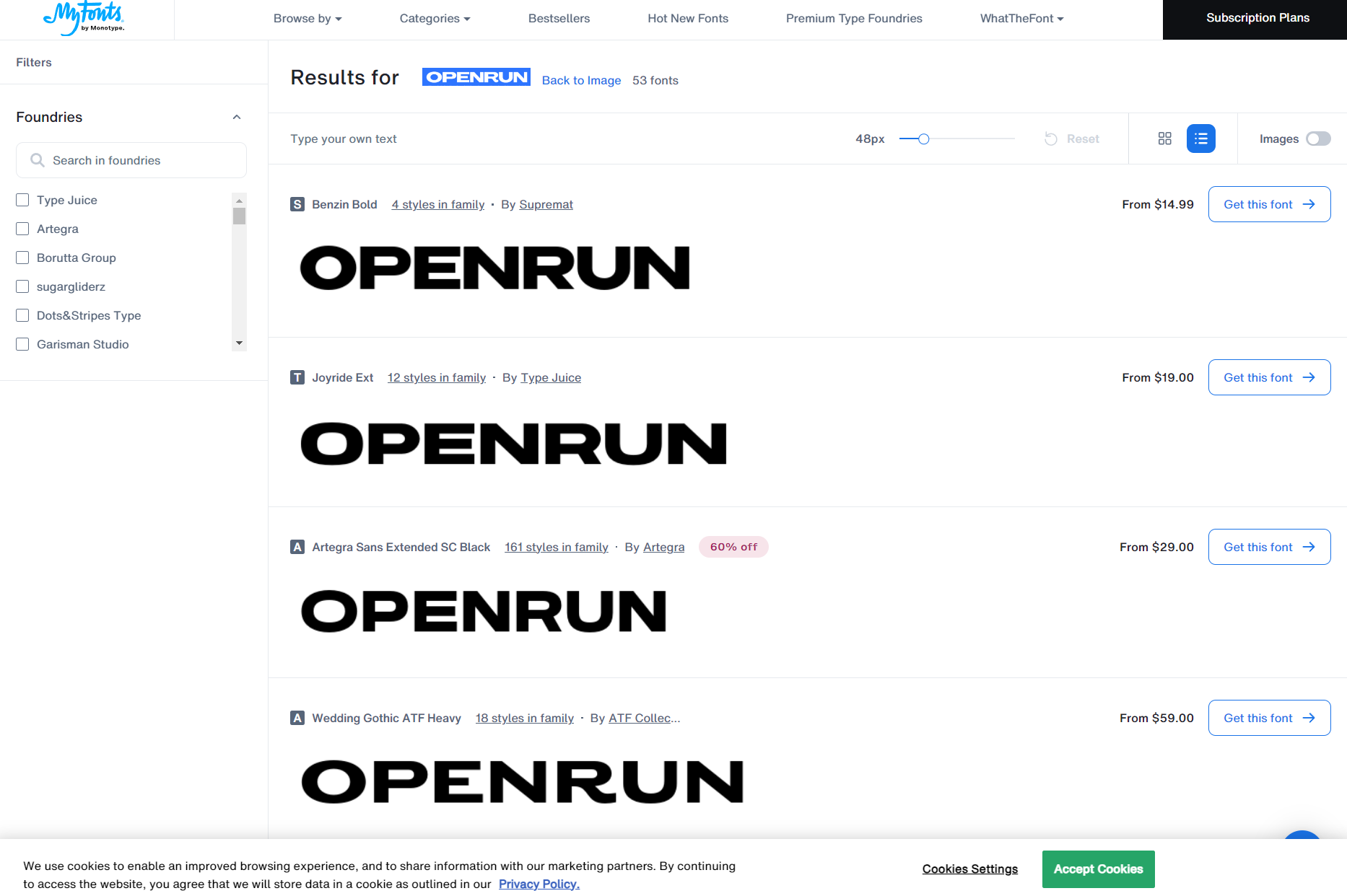 - 검색 결과에서 유료와 무료 글꼴을 확인할 수 있습니다. 원하는 글꼴을 선택하고 글꼴을 다운로드하거나 구매합니다.
