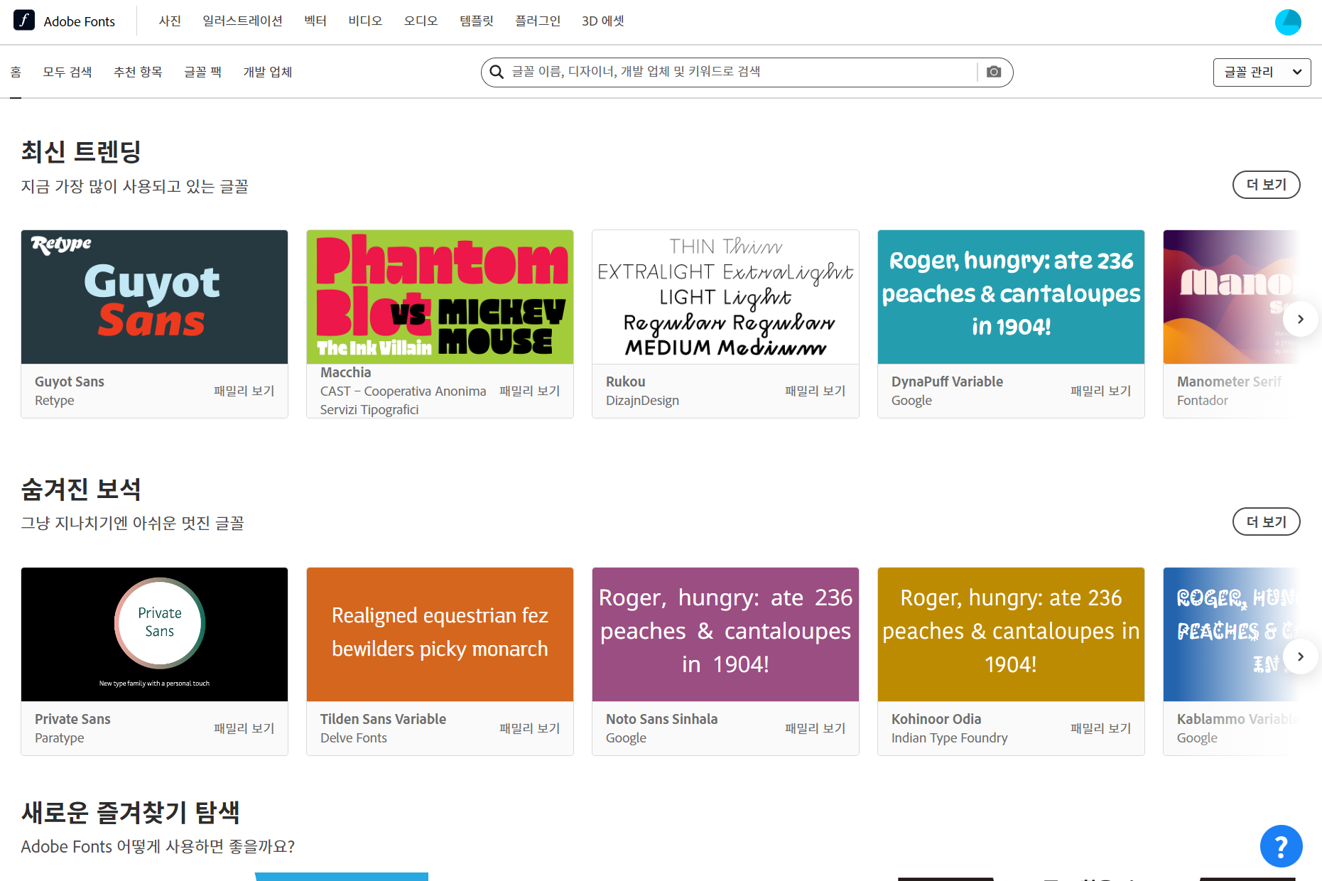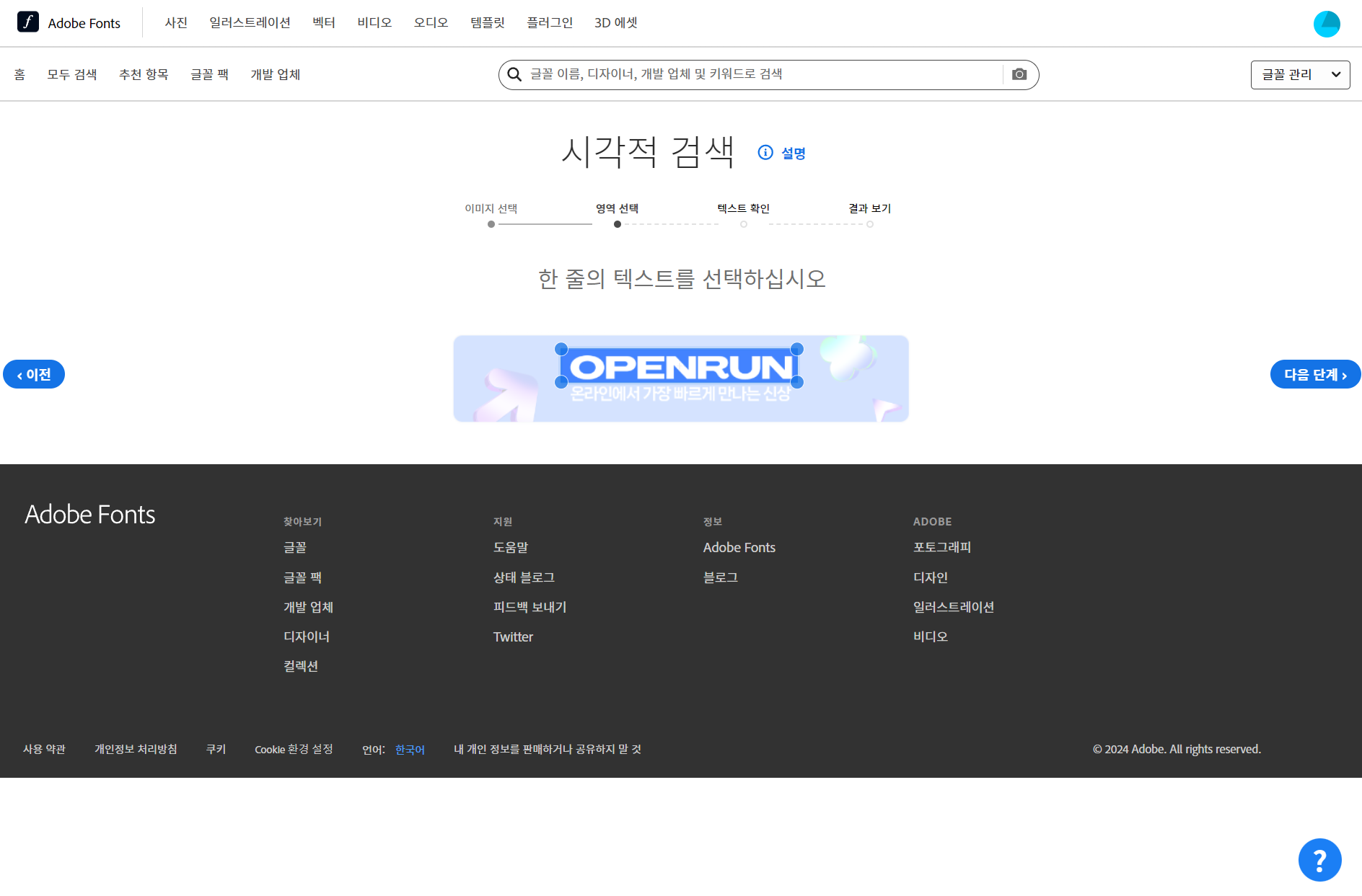 Adobe Fonts(https://fonts.adobe.com/)는 이미지에서 사용된 글꼴을 쉽게 찾고 추가할 수 있는 서비스입니다. 이미지를 업로드하고 텍스트를 선택하면 유사한 글꼴을 찾아볼 수 있으며, 이를 포토샵을 비롯한 다양한 Adobe CC 앱에서 바로 사용할 수 있습니다.