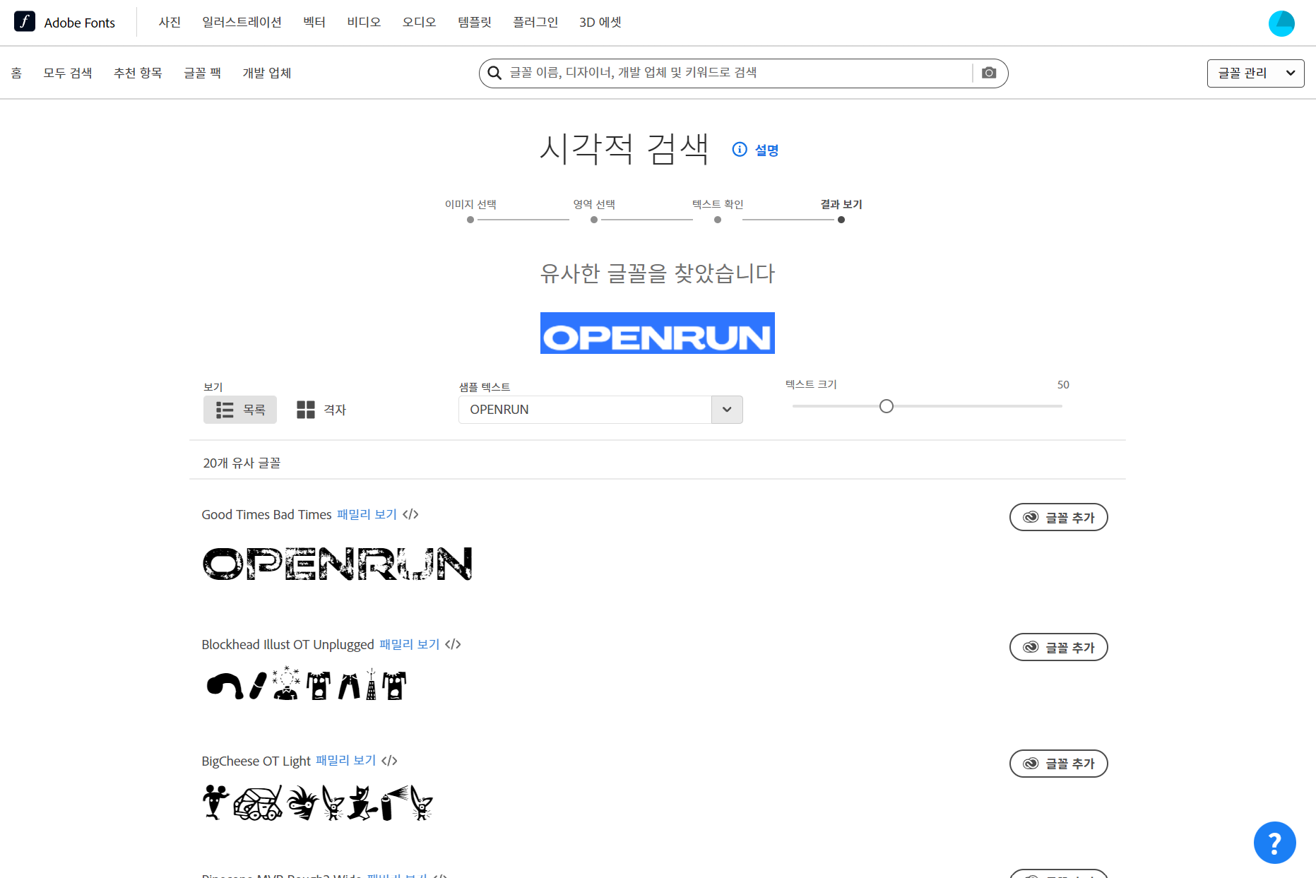 - 글꼴 검색 결과를 확인하고 '글꼴추가'를 클릭하여 포토샵 등의 어도비 앱에서 사용할 수 있습니다. 이미지가 너무 작거나 한글의 경우 검색 결과가 미비할 수 있습니다.