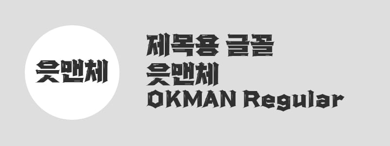 OK금융그룹에서 제작 배포한 3종의 글꼴 중 하나로, 2022년 레드닷 어워드 수상도 받은 글꼴입니다. 강렬하고 힘찬 인상을 주는 것이 특징입니다. 이 서체는 '읏맨체' 시리즈의 일부로, 한글 2350자, 영어 94자, KS심볼 986자를 지원하며, 읏맨 캐릭터 딩벳(폰트 아이콘) 15종도 함께 제공됩니다. 사용자는 온라인, 인쇄, 상품, 광고물 등 상업적으로도 자유롭게 사용할 수 있으며, 개인 및 기업 사용자 모두에게 무료로 제공됩니다. 다만, 폰트 파일의 임의적인 수정이나 유료 판매는 금지되어 있습니다. OK읏찬체는 세로 줄기의 강조와 스크래치 스킨, 뾰족한 가시 형태의 디테일을 통해 독특한 스타일을 완성하였으며, 이를 통해 시각적인 편의성과 주목성을 높였습니다.