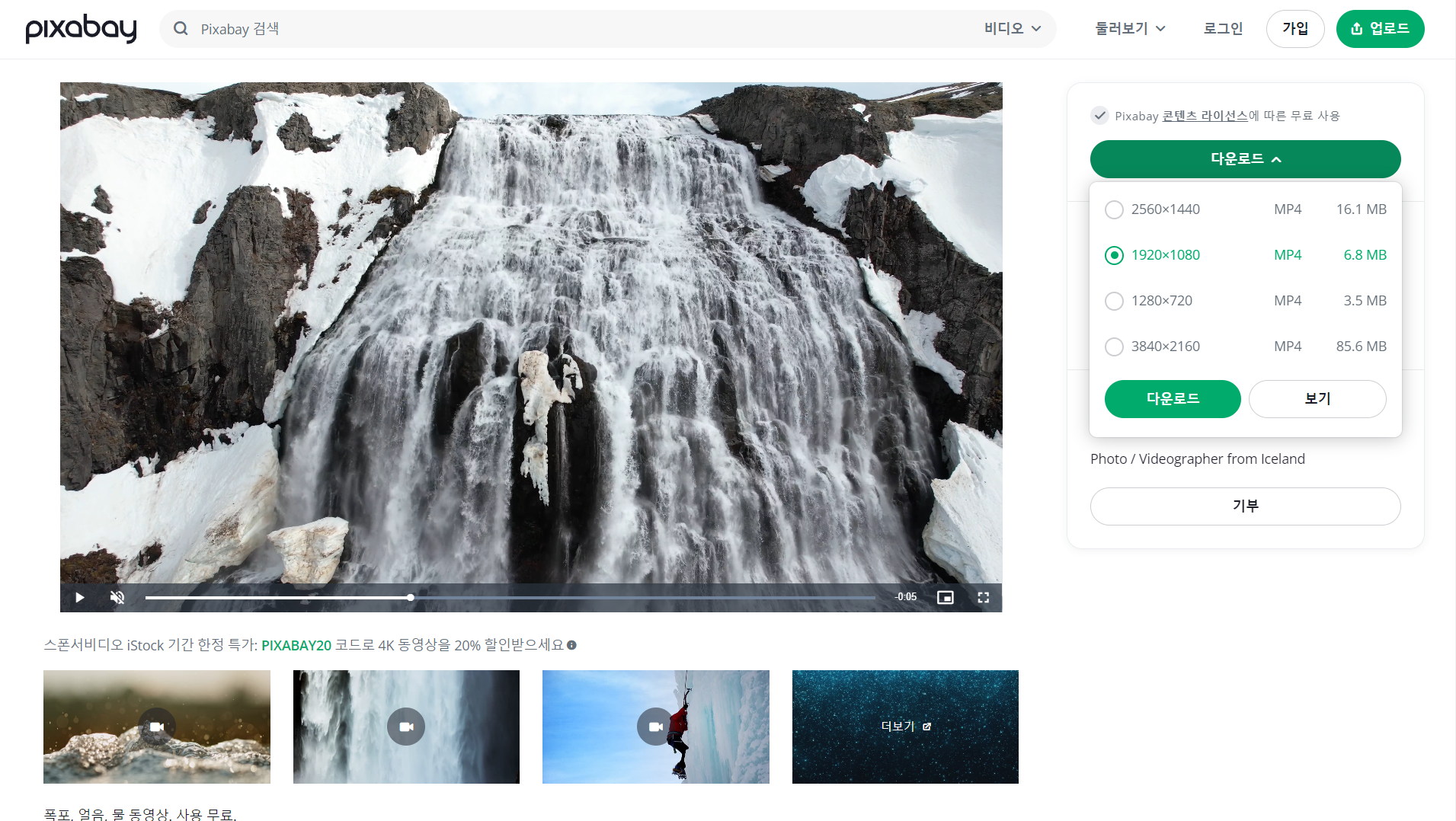 Pixabay는 스톡 이미지를 소개할 때 언급했던 사이트로, 다양한 고품질의 무료 동영상 소스를 제공하는 인기 있는 웹사이트입니다. 한글이 지원되어 편리하며, 사진, 일러스트, 동영상, 음원 등 다양한 무료 소스를 제공합니다. Pixabay는 230만 개 이상의 이미지와 비디오를 보유하고 있으며, 고품질 HD 및 4K 동영상 컬렉션을 갖추고 있습니다. 모든 소스는 간소화된 Pixabay 라이선스에 따라 Creative Commons Zero(CC0)로 공개되어, 사이트의 모든 콘텐츠는 상업적 또는 비상업적 목적, 인쇄 또는 디지털 여부에 관계없이 저작권자의 명시 없이 자유롭게 사용할 수 있습니다. 하지만, 출처를 표기하여 저작권자를 존중하는 것이 좋은 습관이며 예의이므로 되도록 출처를 표기하시길 권해드립니다. 영상 소스는 대부분 1분 미만이지만, HD 및 4K 해상도의 동영상을 다양한 파일 확장자로 다운로드할 수 있습니다.