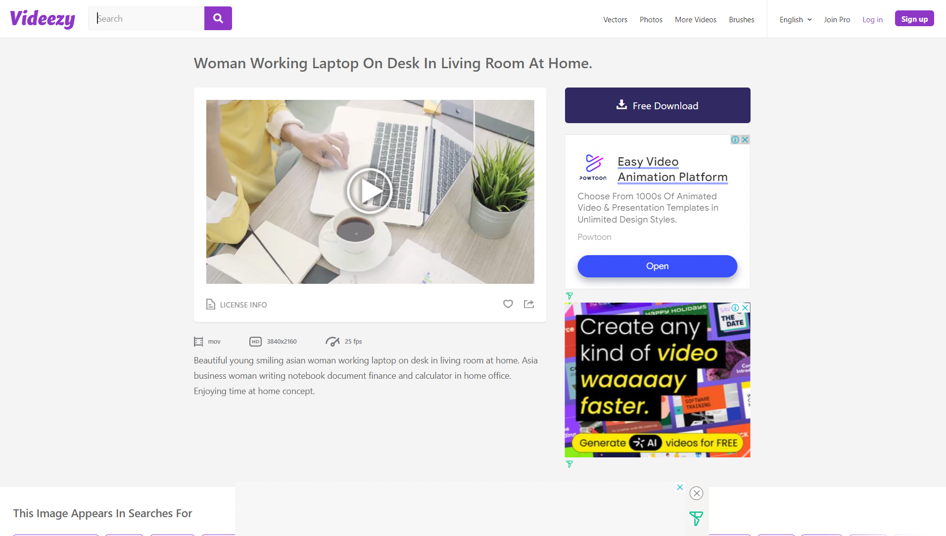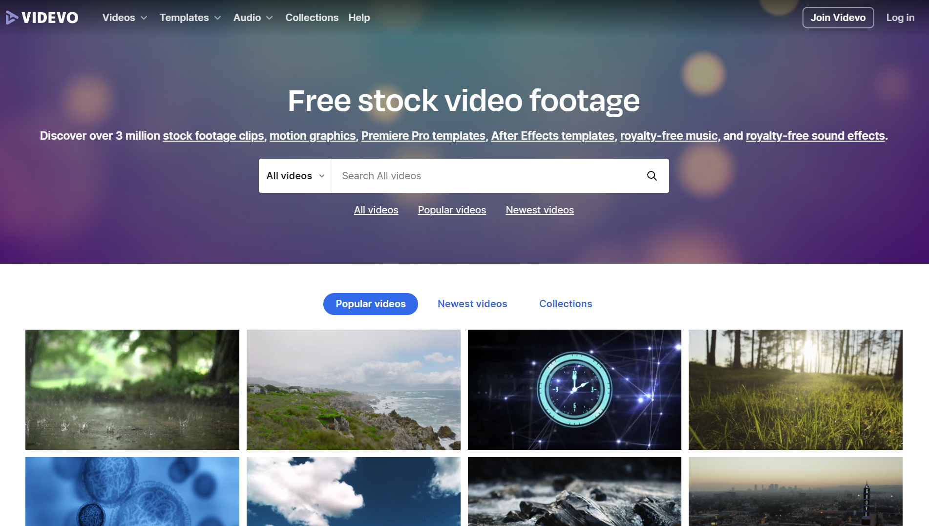 Videvo는 수백만 개의 고품질 무료 및 유료 스톡 동영상을 제공하는 사이트로, 다양한 짧은 영상 소스, 모션 그래픽, 음향 효과, 템플릿 등을 제공하여 인트로 영상에 활용하기에 적합한 풍부한 자료를 제공합니다. 제공되는 파일은 MP4와 MOV 형식으로 대부분의 편집 소프트웨어와 호환됩니다. 또한, HD에서 4K까지 다양한 해상도의 영상을 선택할 수 있어 프로젝트의 요구 사항에 맞게 최적의 영상을 사용할 수 있습니다. 모든 비디오가 무료로 제공되는 것은 아니며, 영상 소스에 따라 저작자 크레딧을 요구하거나 재배포가 금지되는 등 저작권 규정이 다를 수 있으므로 다운로드 전에 라이선스를 잘 살펴보고 사용해야 합니다.