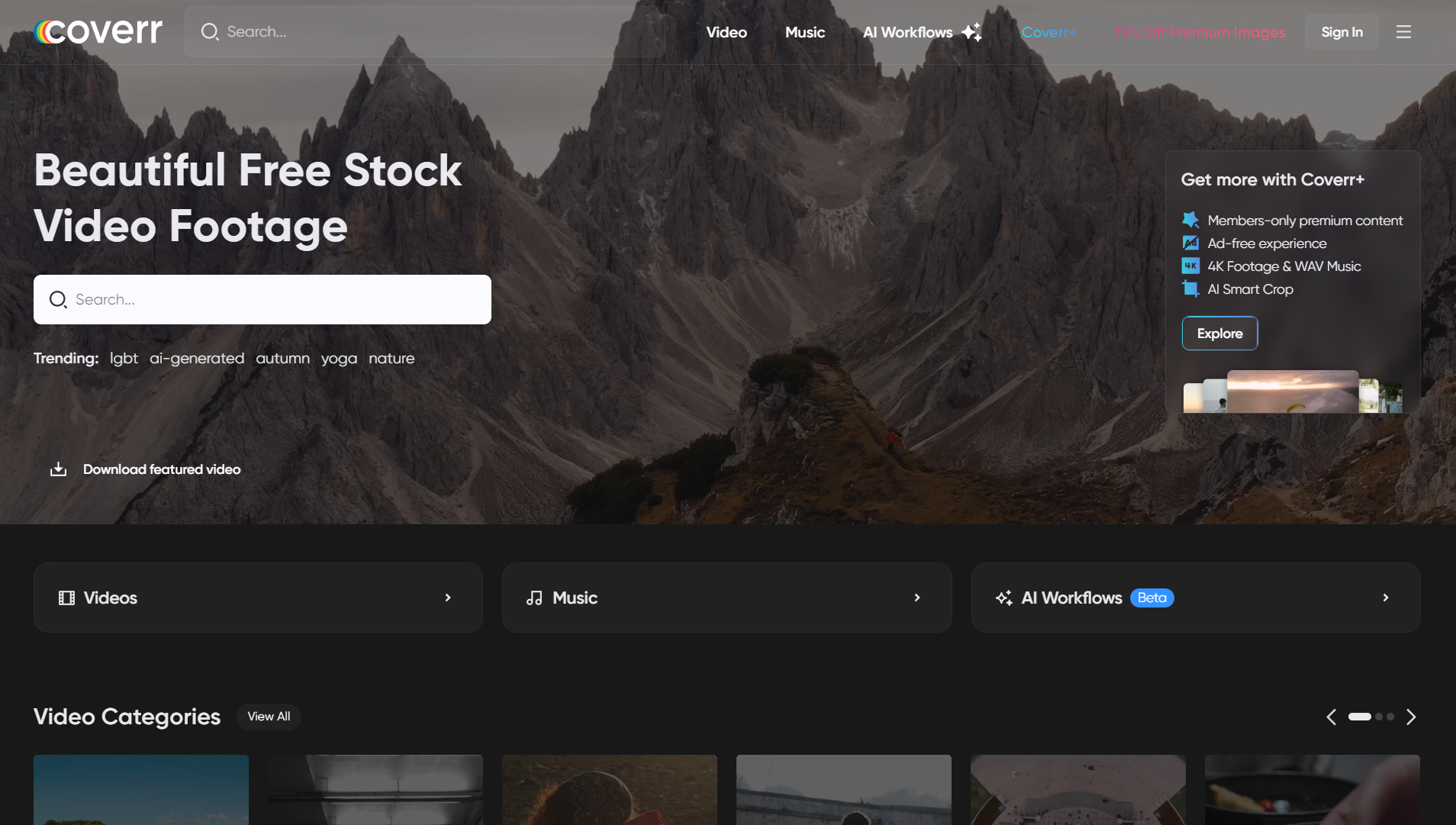 Coverr는 사용자가 어떤 프로젝트에도 무료로 사용할 수 있는 다양한 주제와 카테고리의 고품질 스톡 동영상을 제공하는 웹사이트입니다. 사용자는 회원가입이나 저작권료 없이 상업적 목적을 포함한 모든 프로젝트에 동영상을 자유롭게 사용할 수 있습니다. 항공, 타임랩스, 영화 비디오가 다양한 파일 형식으로 제공되며, 고해상도의 4K 동영상도 포함되어 있습니다. Coverr는 무료 동영상뿐만 아니라 상업적으로 사용 가능한 음악도 제공하여, 영상과 음악을 함께 활용해 다양한 프로젝트나 콘텐츠를 제작할 수 있습니다. 매주 월요일 7개의 무료 동영상 소스가 제공되며, Coverr+ 멤버십에 가입하면 4K 동영상과 WAV 형식의 음악에 접근할 수 있는 독점적인 혜택을 누릴 수 있습니다.