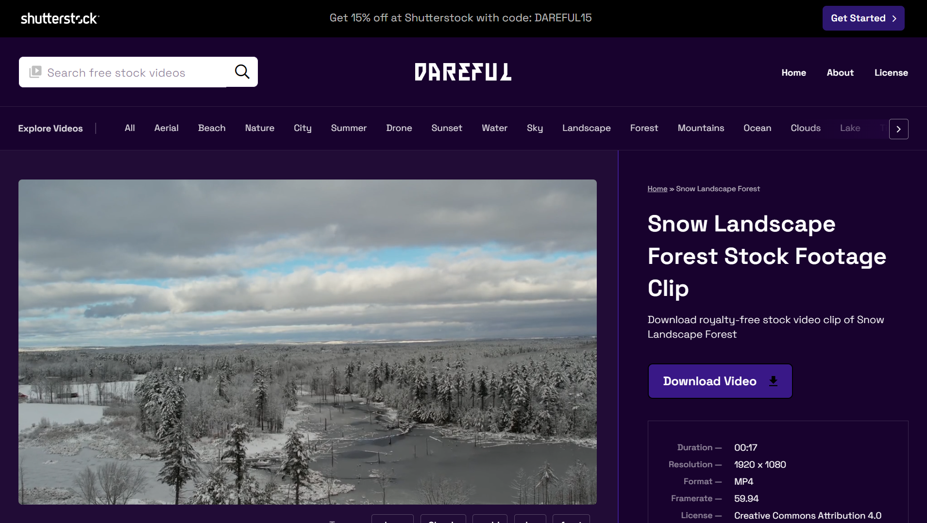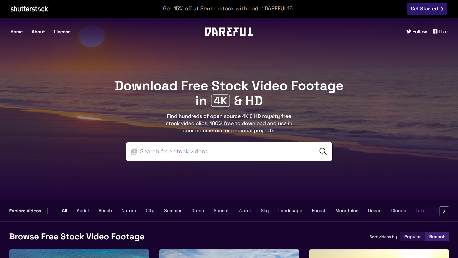 Dareful (이전 명칭 Stock Footage 4 Free)은 호수, 해변, 산, 여름, 공중 전망 등 다양한 카테고리의 고품질 로열티 프리 스톡 비디오를 제공합니다. 개인 또는 상업적 프로젝트에 고품질 영상을 찾는 이들에게 적합합니다. 이 사이트의 모든 영상은 인기 있는 스톡 이미지 및 비디오 플랫폼 Storyblocks의 제작자인 Joel Holland가 촬영했습니다. Dareful은 4K 및 HD 해상도의 슬로우 모션, 루핑, 타임랩스 등 다양한 유형의 고품질 동영상을 수백 개 오픈소스로 제공합니다. 모든 클립은 상업적 또는 개인 프로젝트에서 무료로 다운로드하여 사용할 수 있습니다. 제공되는 파일 형식은 일반적으로 MP4 또는 MOV이며, 대부분의 비디오 편집 소프트웨어와 호환됩니다. 이 웹사이트의 스톡 비디오는 크리에이티브 커먼즈 라이선스(CC 4.0)에 따라 제공되므로 사용할 때마다 출처를 표시해야 합니다.