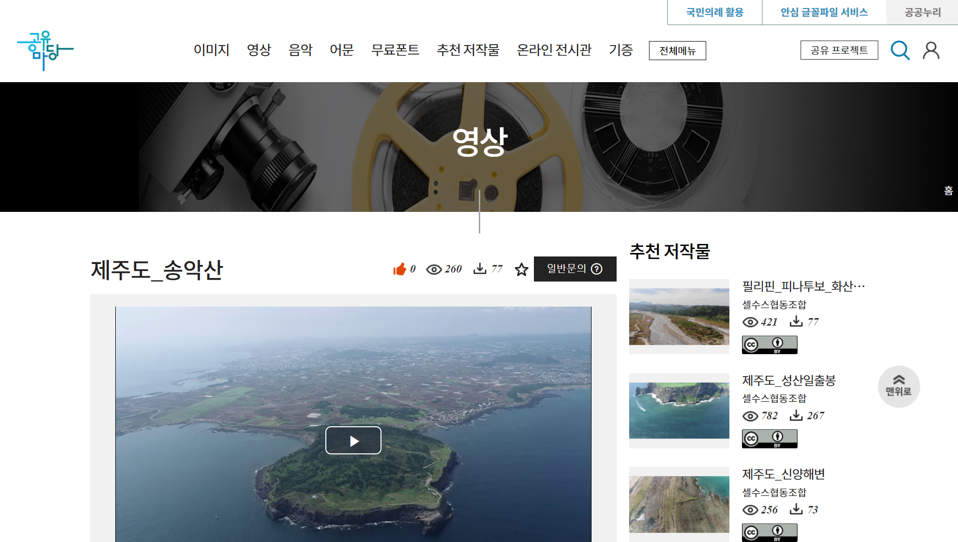 공유마당은 한국저작권위원회에서 제공하는 무료 콘텐츠 공유 서비스로, 앞에서 여러번 소개드린 적이 있습니다. 이 사이트는 저작권자가 일정한 조건 하에 자신의 저작물을 다른 사람이 자유롭게 이용할 수 있도록 허락한 저작물들을 대량으로 보유하고 있습니다. 사용자는 사진, 일러스트, 폰트, 음원, 그리고 영상 등의 다양한 자료를 찾아볼 수 있으며, 필요한 자료를 쉽게 검색하고 다운로드할 수 있습니다. 특히 영상 자료의 경우, 다양한 해상도와 파일 형식으로 제공되어, 사용자의 필요에 맞춰 선택할 수 있는 유연성을 갖추고 있습니다. 공유 마당은 우리나라의 자연 등을 주제로 하는 영상 소스를 찾을 때 유용합니다.