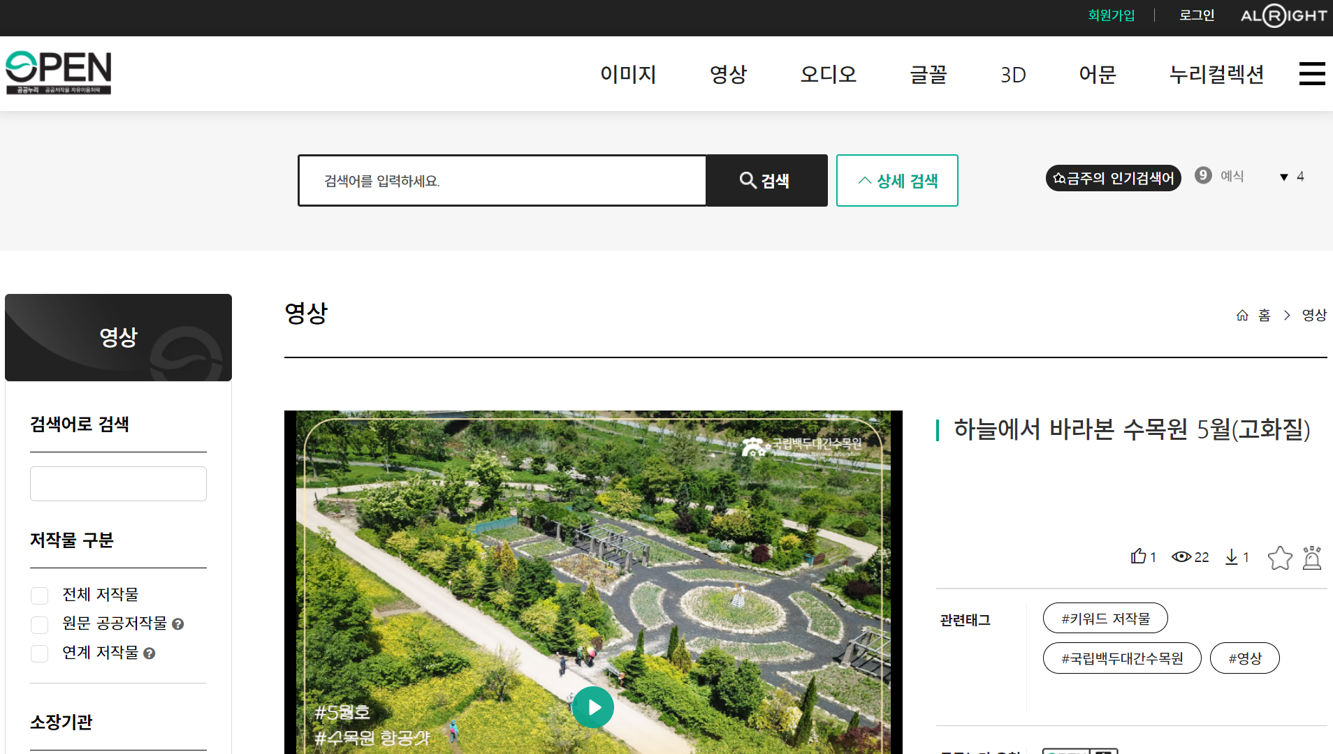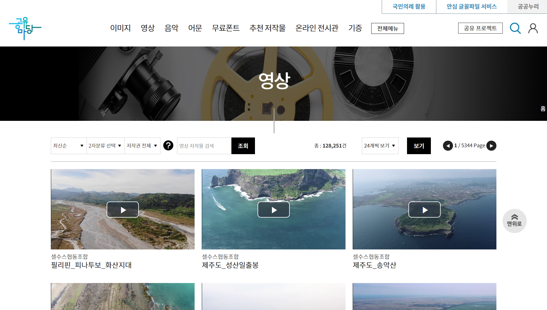 공공누리는 우리나라 국가기관, 지방자치단체, 공공기관이 창작한 다양한 저작물을 국민 누구나 자유롭게 이용할 수 있도록 개방하는 서비스로 역시 앞선 뉴스레터에서 여러번 소개드렸습니다. 이 사이트는 사용자가 저작권 걱정 없이 사진과 영상 등 다양한 소스를 다운로드하여 사용할 수 있도록 공공 저작물을 제공합니다. 공공누리에서 제공하는 동영상은 다양한 해상도와 파일 형식으로 이용 가능하여, 프로젝트의 필요에 맞게 선택할 수 있습니다. 공공기관에서 제작한 영상 소스를 제공하므로 우리나라 공공 시설과 자연 등을 주제로 하는 영상 소스를 찾을 때 유용합니다.