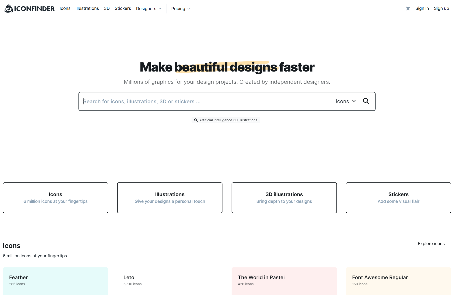 Iconfinder는 다양한 벡터 아이콘, 일러스트레이션, 3D 일러스트레이션을 제공하는 세계 최대의 마켓플레이스입니다. 840만 개가 넘는 무료 및 프리미엄 그래픽 리소스를 제공합니다. 로고, 비즈니스, 소셜 미디어, 교육, 이모지 등 다양한 주제별로 정리된 아이콘을 쉽게 찾을 수 있으며, SVG, AI, PNG 형식으로 다운로드 할 수 있습니다. 이 사이트는 사용자가 필요한 아이콘을 빠르고 정확하게 찾을 수 있도록 고급 검색 기능도 제공합니다. 프로젝트에 따라 작업에 필요한 아이콘의 크기가 다를 수 있는데, Iconfinder를 사용하면 미리보기를 통해 사이즈를 조정해서 확인하고, 원하는 사이즈로 다운로드할 수 있습니다.