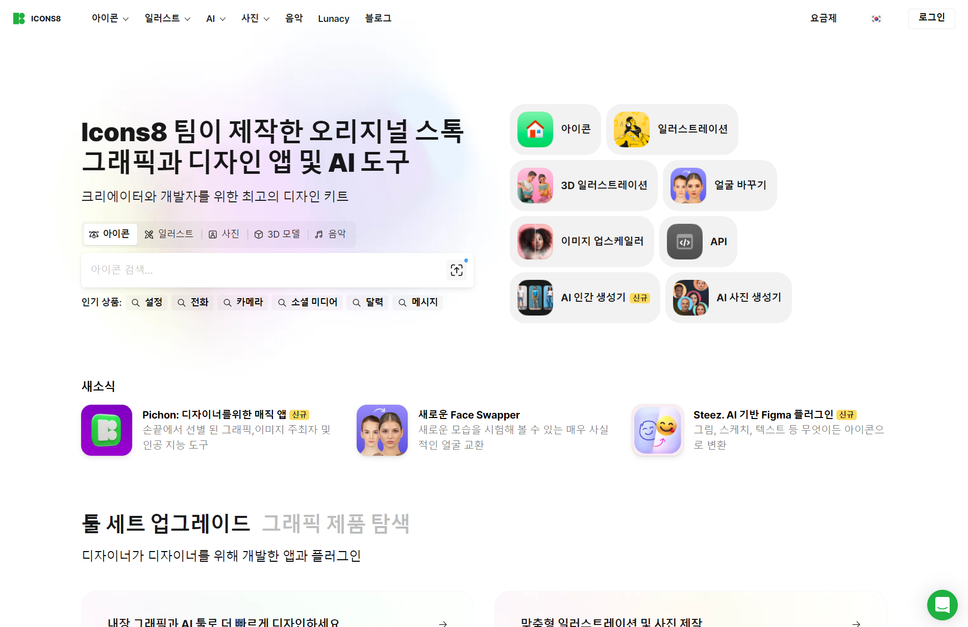 Icons8은 한국어를 지원하는 통합 디자인 플랫폼으로 1,350,200개의 방대한 아이콘을 포함하여 일러스트레이션, 사진, 음악, 폰트 등의 디자인 자료를 제공하는 사이트입니다. 아이콘을 선택한 후에는 색상과 세부사항을 수정하거나, 다른 아이콘과 결합하거나, 텍스트를 추가하는 등의 다양한 편집 옵션을 활용할 수 있습니다. 플러그인을 다운 받으면 포토샵, 일러스트, 피그마, 구글 애드온에서 Icons8의 아이콘을 바로 사용할 수 있습니다. 또한 AI 도구를 통해 이미지를 확대하거나 해상도를 높이는 등의 작업도 할 수 있습니다. ‘이미지로 검색’ 기능을 통해 원하는 아이콘을 쉽게 찾아볼 수 있습니다. 만약 원하는 아이콘을 찾지 못했다면, Icons8에 요청을 보낼 수 있습니다. 디자이너라면 자신의 아이콘을 ‘아이콘 제출하기’ 기능을 통해 추가 수익을 얻을 수도 있습니다. Icons8은 무료로 제공되는 자료도 있지만, 대부분의 자료는 유료로 구매해야 하므로 사용 전 유료 여부를 확인하시기 바랍니다.
