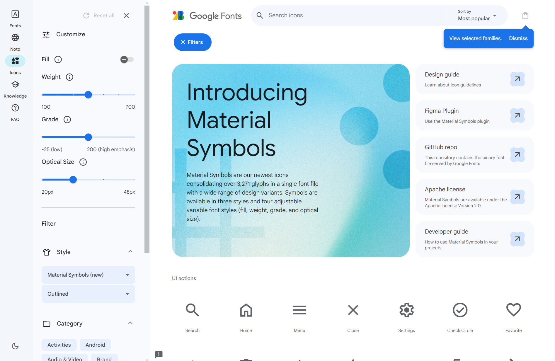 Google Fonts의 아이콘 페이지는 Google에서 제공하는 아이콘 라이브러리로, 웹 및 앱 프로젝트에서 사용하기 용이합니다. 이 사이트에서는 Material Symbols 라는 플랫한 스타일의 아이콘들을 테마별로 다운받을 수 있습니다. Material Symbols는 3,271개 이상의 글리프를 단일 폰트 파일로 제공하며, 다양한 디자인 변형을 지원합니다. 이 아이콘들의 디자인 타입은 5가지(Outlined, Filled, Rounded, Sharp, Twotone)를 지원하며 네 가지 조절 가능한 변수 폰트 스타일(채우기, 무게, 등급, 광학 크기)로 제공됩니다. 원하는 아이콘을 HTML 요소에 추가할 수 있습니다. 예를 들어, <i class="material-icons">face</i>와 같이 사용할 수 있습니다. 사용자 정의 스타일을 추가하여 아이콘의 크기나 색상 등을 변경할 수도 있습니다.