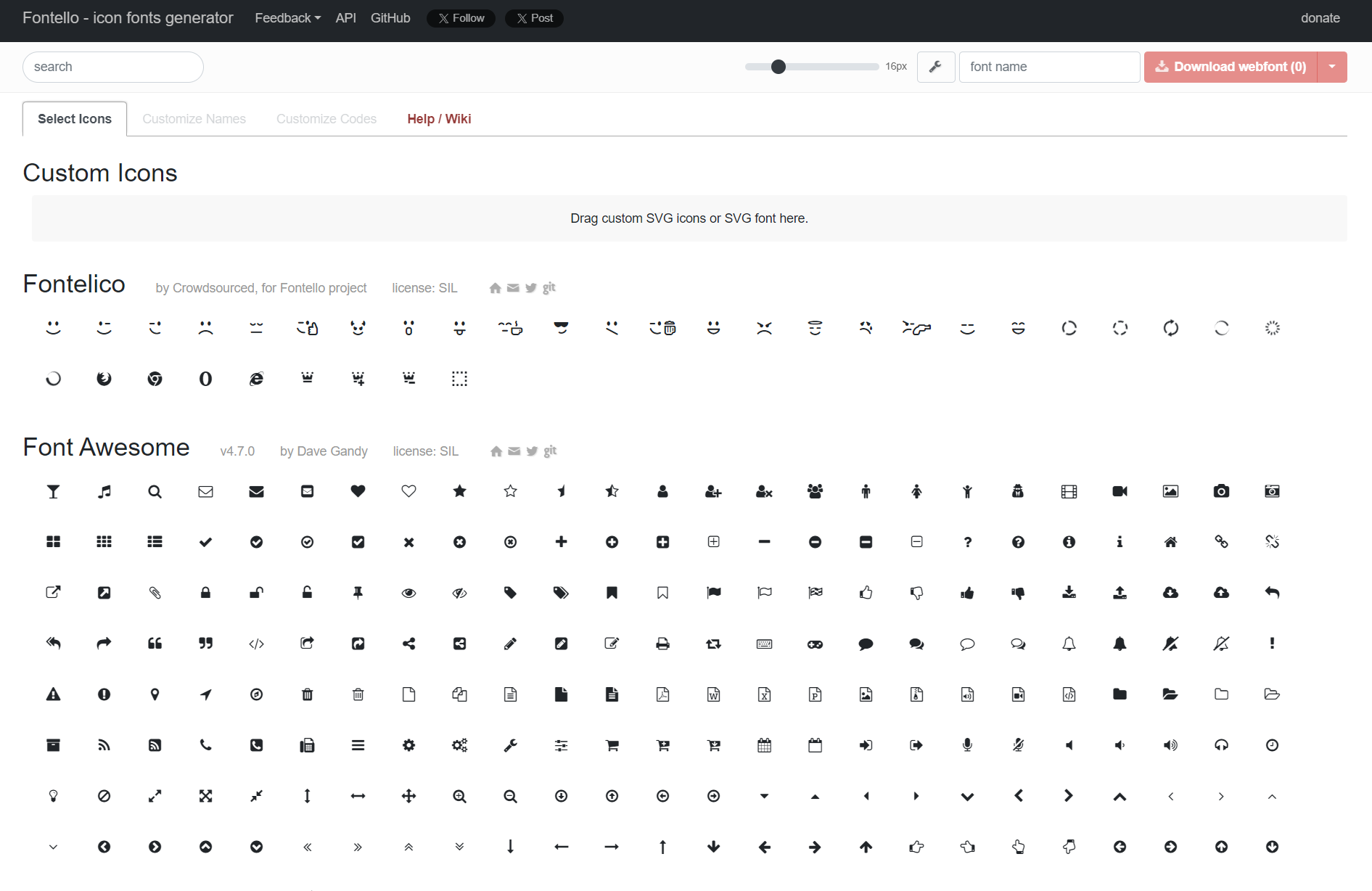 Fontello는 벡터 이미지를 웹 폰트로 변환해 주는 사이트입니다. SVG 파일을 업로드하여 원하는 아이콘을 추가할 수 있습니다. 페이지 상단의 슬라이더를 이용하면 픽셀 크기를 조정할 수 있고, 폰트 파일 이름도 바꿀 수 있습니다. 이 사이트를 통해 아이콘을 폰트로 넣게 되면 CSS의 color 속성을 사용해 코드의 색상을 변경할 수 있습니다. 이렇게 만든 웹포트 묶음을 다운로드 할 수 있습니다.