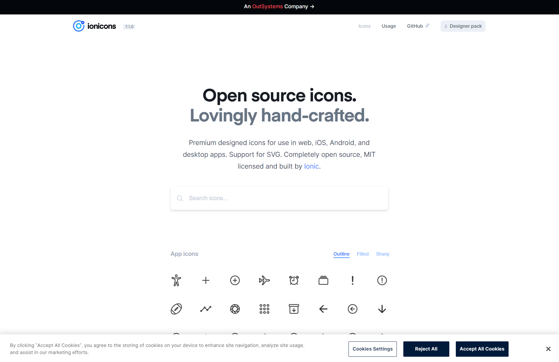 Ionicons은 모바일 앱을 만드는 Ionic 사의 Framework를 위한 프리미엄 오픈 소스 아이콘 팩을 제공합니다. 이 아이콘 팩은 1,300개의 아이콘이 포함되어 있으며 웹, iOS, Android, 데스크톱 앱에서 사용할 수 있습니다. SVG를 지원하며, 완전히 오픈 소스이고 MIT 라이선스에 따라 무료로 제공되므로 자세한 저작권은 해당 내용을 확인하시면됩니다. 각 앱 아이콘에는 채워진 버전, 윤곽선 버전, 선명한 버전이 있어 다양하게 활용할 수 있습니다. 아이콘의 크기는 사전 정의된 폰트 크기를 사용하거나, ion-icon 컴포넌트에 font-size CSS 속성을 적용하여 특정 크기를 설정할 수 있습니다.