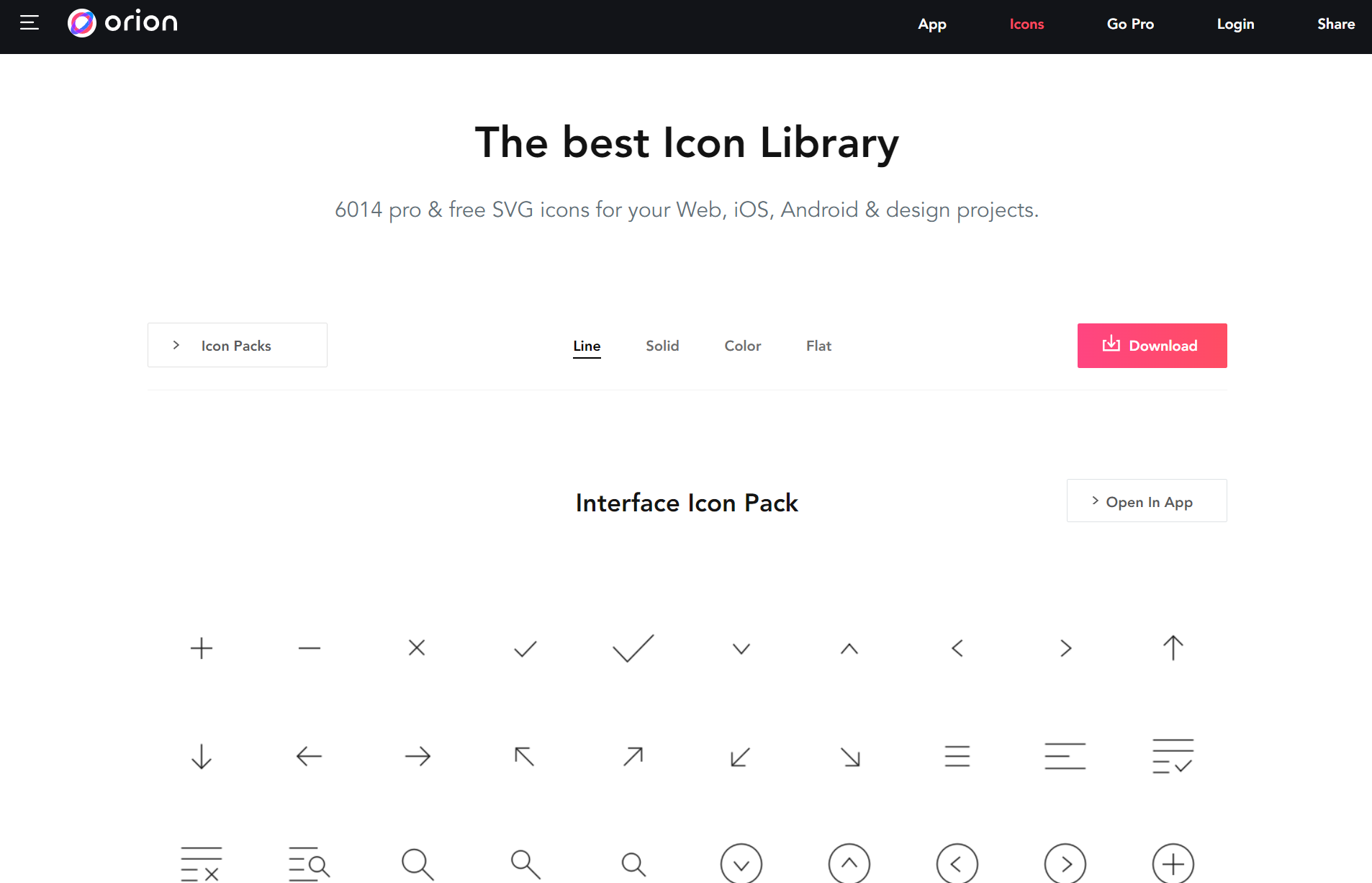 Orion Icon Library는 웹, iOS, Android 및 디자인 프로젝트를 위한 6014개의 무료 SVG 및 PNG 아이콘을 제공하는 사이트입니다. 이 사이트는 다양한 프로젝트에 적합하도록 선, 솔리드, 컬러 및 플랫 아이콘을 제공하며, 다양한 스트로크 무게, 색상 등으로 편집할 수도 있습니다. 이 사이트는 아이콘을 찾고, 정리하고, 편집하고, 다운로드하는 데 필요한 모든 기능을 제공하며, SVG도 지원합니다.