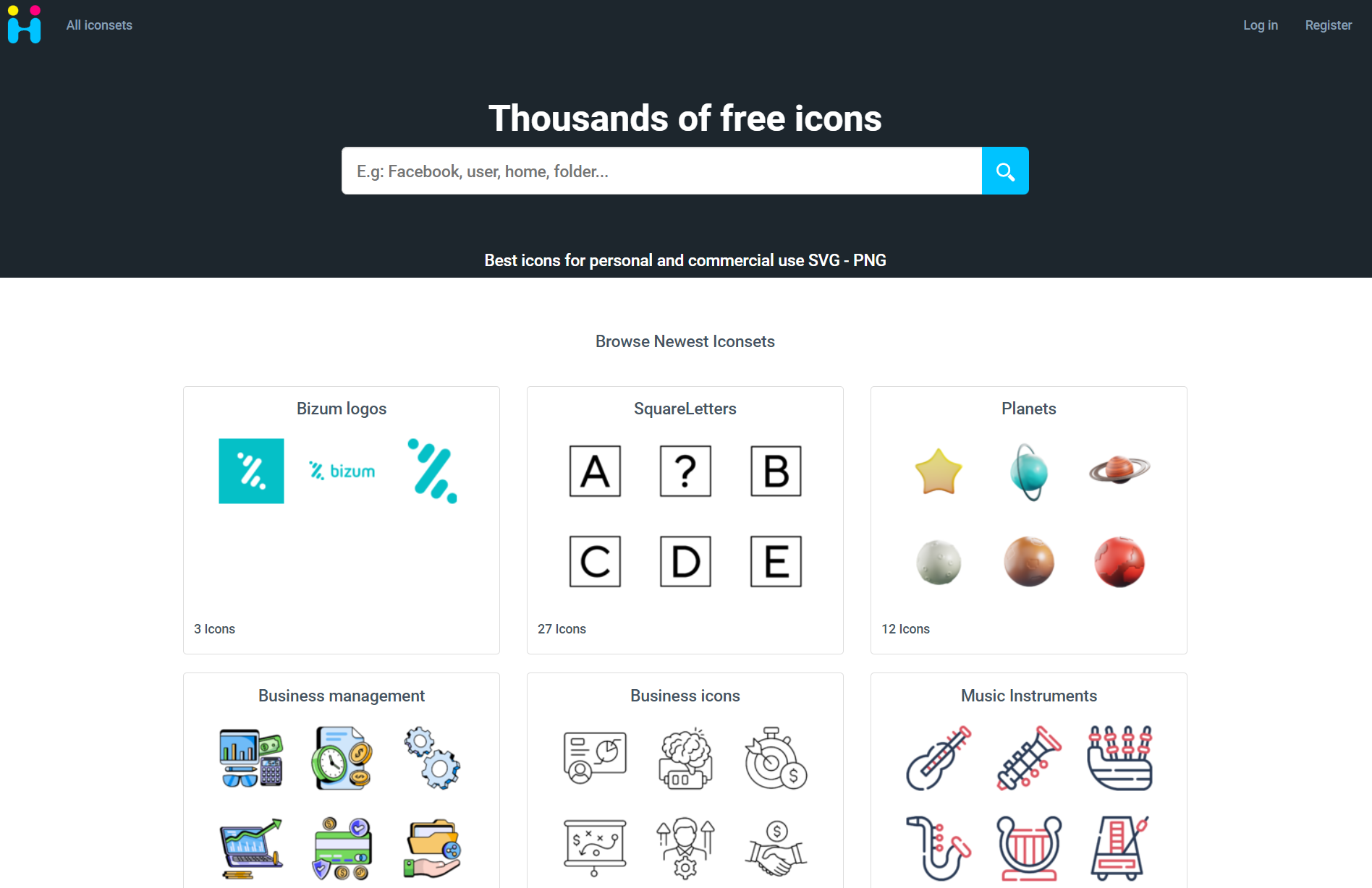 icon-icons은 다양한 아이콘을 제공하는 웹사이트입니다. SVG, PNG, ICO, ICNS 형식으로 다운로드 받을 수 있으며 아이콘 수는 적지만 플랫, 3D아이콘을 제공합니다. 주요 브랜드의 수천 가지 로고와 다양한 스타일의 소셜미디어 아이콘을 찾을 수 있습니다.