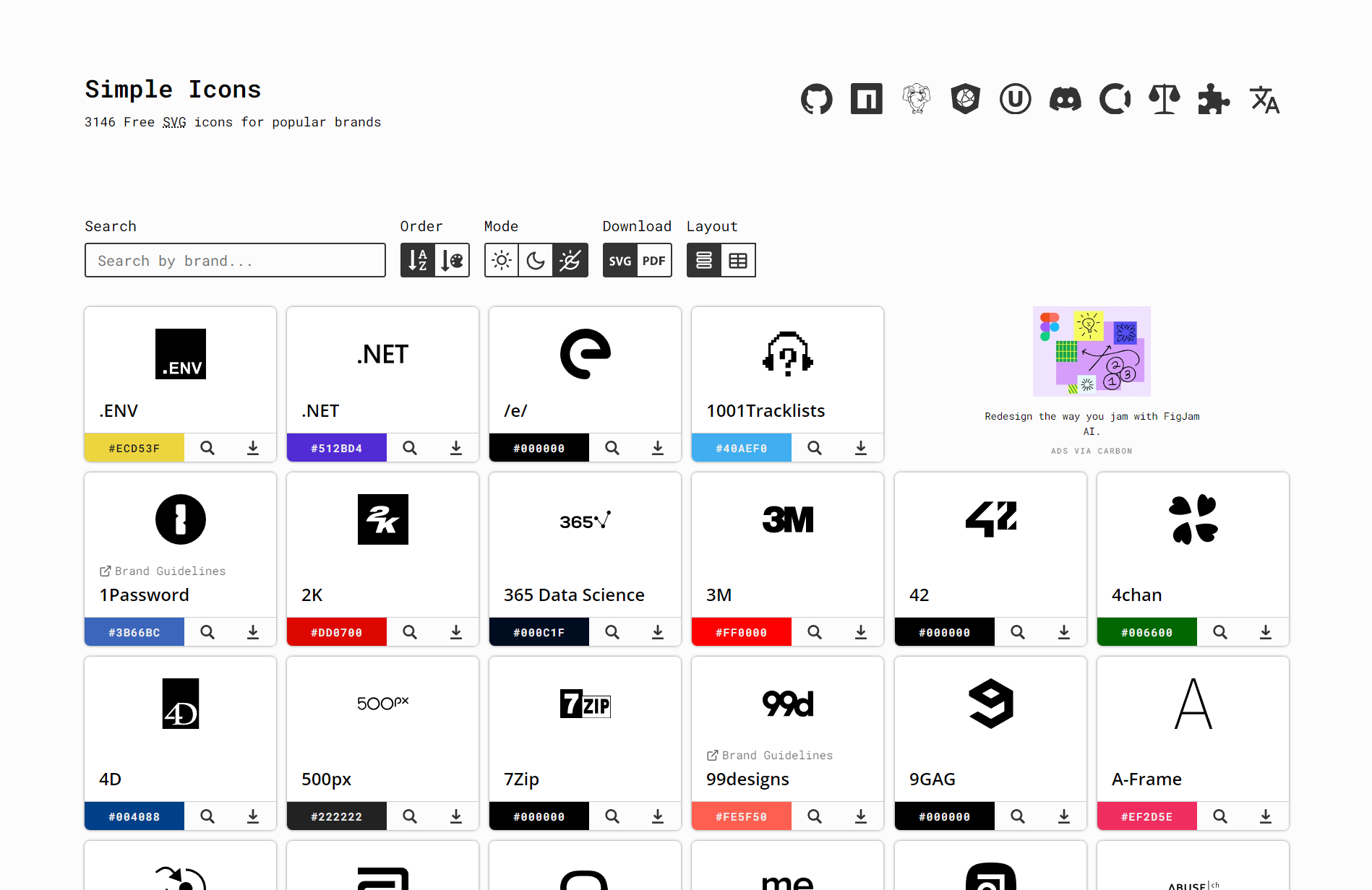Simple Icons는 약 2700개 이상의 유명 브랜드 로고 아이콘을 제공하는 웹사이트입니다. 사용자는 원하는 아이콘을 검색하고, SVG 또는 PDF 형식으로 다운로드할 수 있습니다. 또한, 각 아이콘에 대한 SVG 인라인 코드를 복사하여 코드에서 사용할 수 있으며 브랜드의 색상 코드 값(Hex code)도 확인할 수 있습니다. 유명 브랜드 로고인 만큼 아이콘 마다 라이센스 확인에 주의하시기 바랍니다.