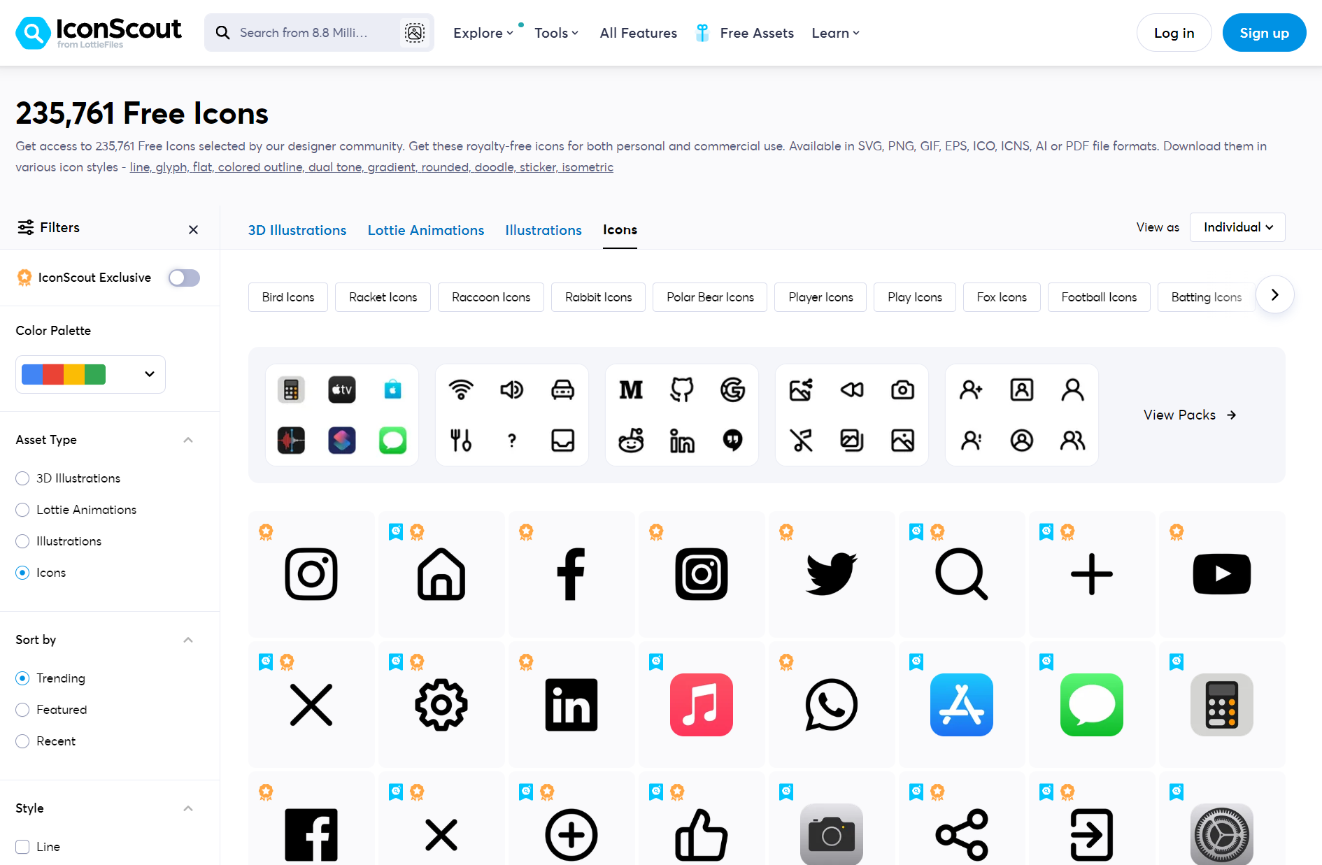 IconScout은 다양한 디자인 스타일에서 사용할 수 있는 20만개가 넘는 무료 아이콘을 제공합니다. SVG, PNG, GIF, EPS, ICO, ICNS, AI 또는 PDF 파일 형식으로 아이콘을 다운로드 받을 수 있습니다. 또한, 브랜드와 색상 팔레트에 맞게 아이콘을 편집할 수 있습니다. 구글 슬라이드, 캔바 등의 프로그램에서 바로 사용할 수 있는 애드온을 제공합니다.