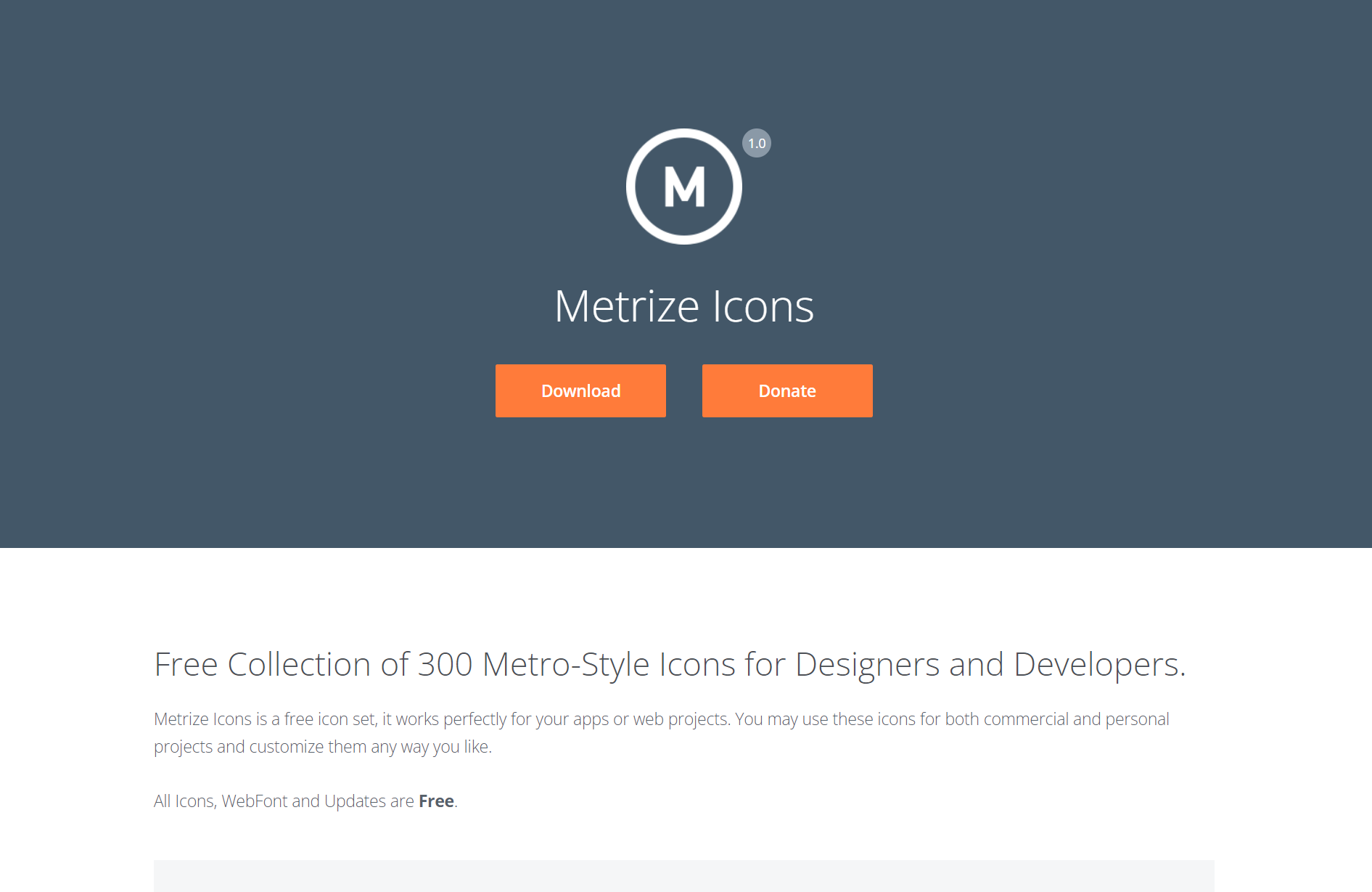 Metrize Icons는 디자이너와 개발자를 위한 300개의 메트로 스타일 아이콘을 무료로 제공하는 사이트입니다. 이 아이콘 세트는 앱이나 웹 프로젝트에 완벽하게 작동하며, 상업적이거나 개인적인 프로젝트에 사용할 수 있고 원하는 대로 커스터마이징이 가능합니다. 모든 아이콘, 웹폰트 및 업데이트는 무료이며, 다운로드에는 PSD(단일 모양 레이어), SVG(단일 아이콘 512 x 512), EPS, AI, PDF, 웹 폰트가 포함되어 있습니다. 또한, IE7과의 호환성을 위한 필요한 스크립트와 전체 문자 맵이 포함된 Metrize Font Icons도 번들로 제공됩니다.