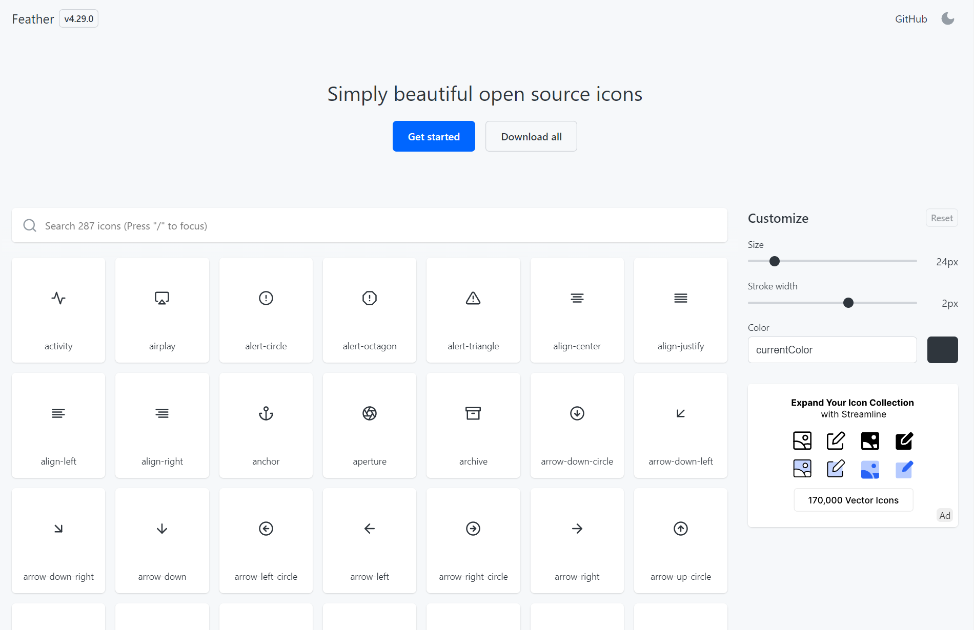 Feathericons 은 사용자가 자신의 프로젝트에 쉽게 통합할 수 있는 간결한 디자인의 오픈 소스 아이콘 컬렉션을 제공합니다. 각 아이콘은 단순성, 일관성 및 가독성에 중점을 두고 24x24 그리드에서 디자인되어 있습니다. 이 사이트는 다양한 UI 디자인 요구에 맞춰 조정 가능한 스트로크 너비와 색상을 포함하여, 사용자가 필요에 따라 아이콘을 맞춤 설정할 수 있는 기능도 제공합니다.