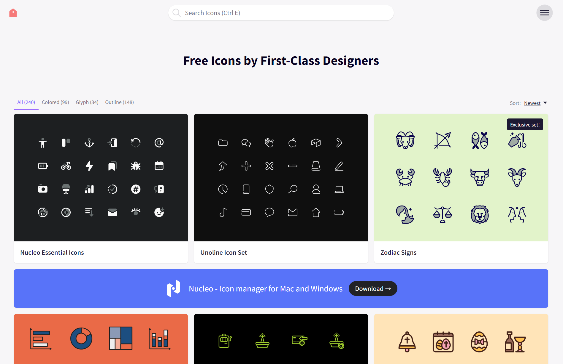 IconStore는 다양한 디자이너들이 만든 무료 벡터(SVG) 아이콘을 상업적으로 사용할 수 있도록 제공하는 온라인 라이브러리입니다. 이 사이트는 비즈니스 관련 아이콘뿐만 아니라 별자리, 몬스터, 부활절, 지중해 마을, 동물, 해리포터, 스타워즈, 발렌타인 등 다양한 테마의 아이콘을 제공합니다. 특히, 맥과 윈도우를 위한 아이콘 관리 앱인 Nucleo와 같은 독점적인 세트도 제공하고 있어, 사용자가 아이콘을 더욱 효율적으로 관리하고 사용할 수 있게 돕습니다.