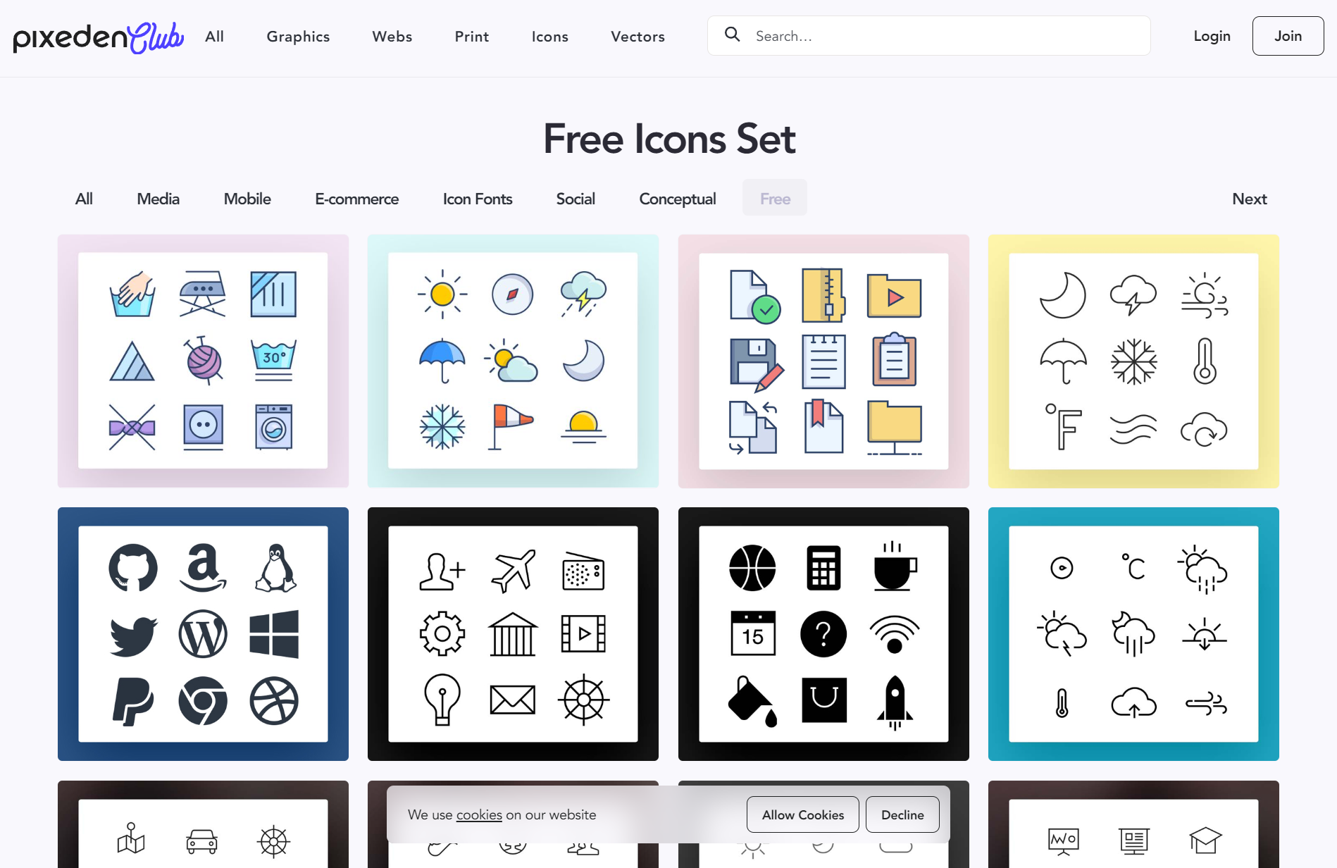 Pixeden은 다양한 프리미엄 및 무료 디자인 자원을 제공하는 웹사이트입니다. 하나의 아이콘을 비슷한 스타일의 여러 종류로 다운로드할 수 있습니다. 각 무료 아이콘 세트는 16x16부터 512x512까지 다양한 크기의 PNG 형식 아이콘 세트를 다운로드할 수 있으며, 일부 아이콘 세트는 벡터 형태의 완전히 레이어화된 어도비 포토샵 PSD 파일로 제공됩니다. 깔끔한 스타일의 아이콘 팩을 회원가입 없이 무료로 다운로드할 수 있습니다.