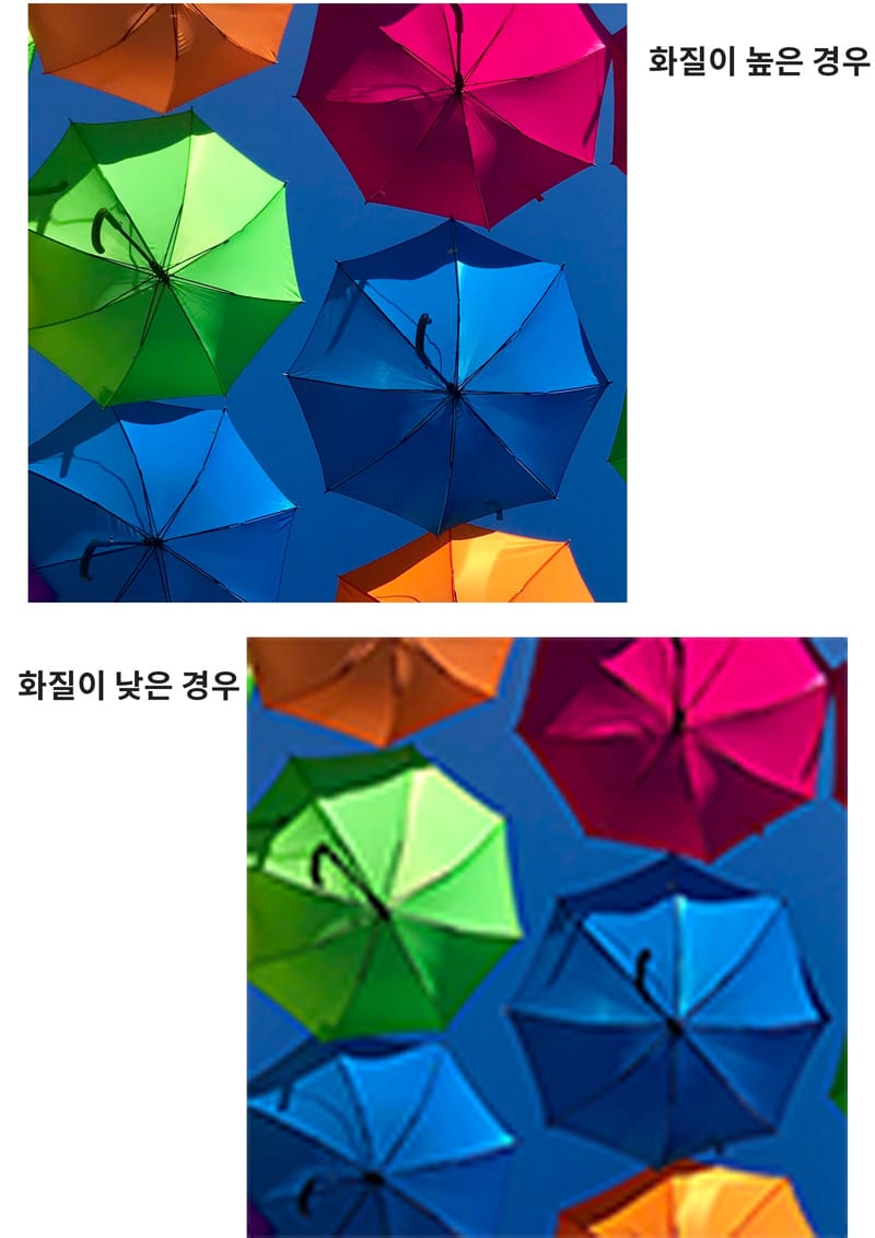 디자인 콘텐츠가 보여질 매체의 크기에 맞추어 적절한 화질을 유지해야 합니다. 화질은 곧 해상도를 말하는 것인데 1 인치당 픽셀의 수를 보통 해상도라 합니다. 픽셀이 많을 수록 해상도가 높고 많은 수의 색상을 포함할 수 있습니다. 대체로 이미지의 크기나 용량이 크면 화질도 크다고 생각하시면 쉽습니다.