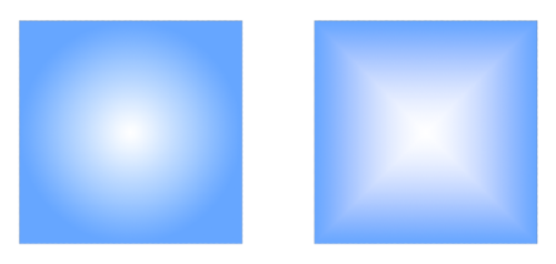 - 방사형 또는 원형(Radial) : 중심에서 바깥쪽으로 색상이 뻗어나가는 형태로, 원형 또는 다각형으로 색상이 변화합니다. 중심점을 강조하거나, 원형 패턴을 만드는 데 효과적입니다.