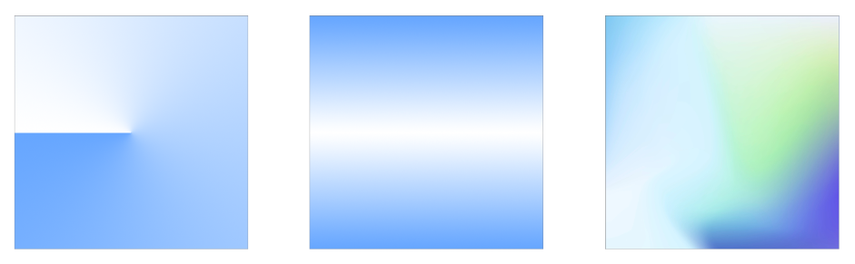 - 자유형(Freeform) 혹은 메시형(Mesh), 다중(Multiple) : 사용자가 지정한 방식에 따라 색상이 자유롭게 분포되는 형태로 여러 색이 겹친, 추상적인 형태의 그라데이션 입니다. 복잡한 색상 전환과 다양한 시각적 효과를 만들어낼 수 있습니다.