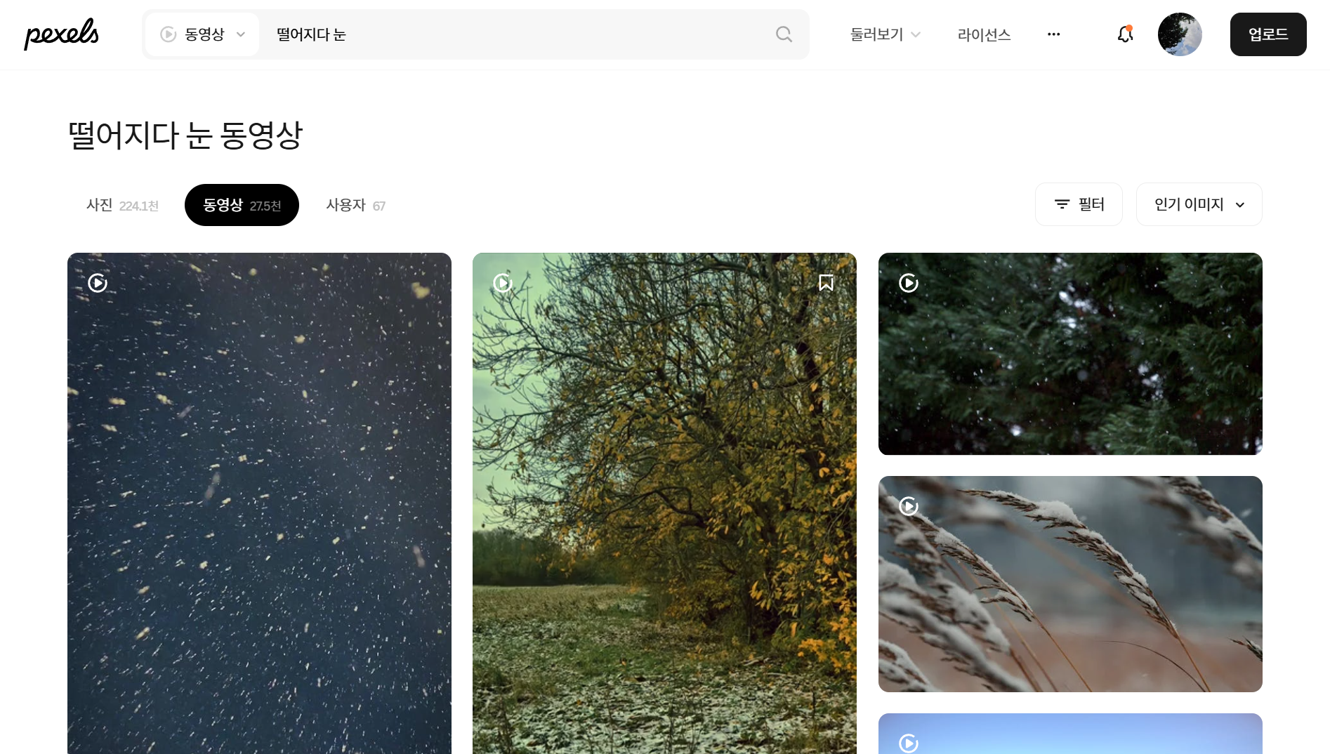 2.눈 내리는 동영상 소스를 다운로드하기 위해 펙셀즈 https://www.pexels.com/ko-kr/ 로 접속합니다. 키워드를 ‘떨어지다’ “눈” 으로 설정하고 동영상을 검색합니다. 가장 먼저 나타나는 눈 내리는 영상을 다운로드 해둡니다.