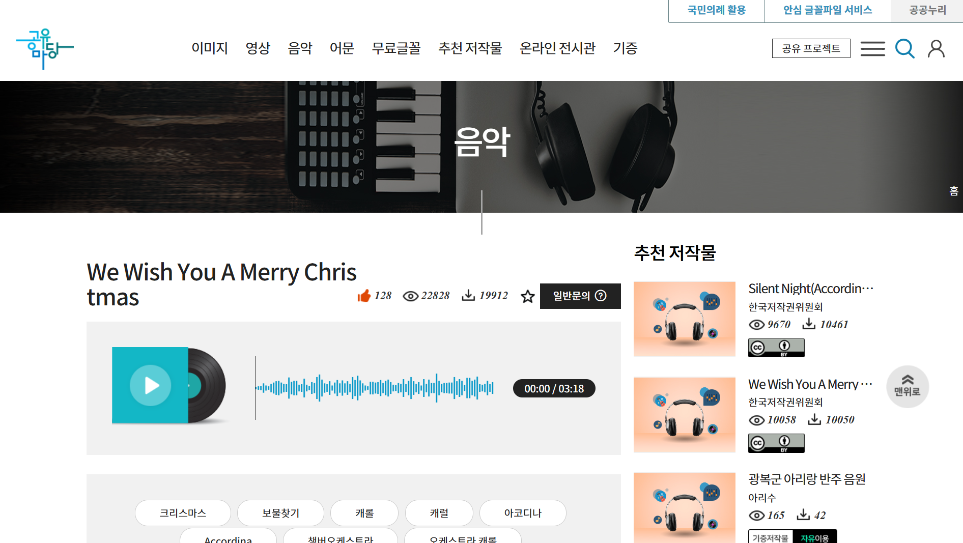 3.캐롤 음원을 다운로드하기 위해 공유 마당 https://gongu.copyright.or.kr/ 으로 접속합니다. 저작물 유형을 ‘음악’ 으로 설정하고 ‘캐롤’을 키워드로 검색합니다. 검색 결과가 나타나면 ‘한국저작권위원회’가 제공하는 We Wish You a Merry Christmas 를 다운로드 합니다.