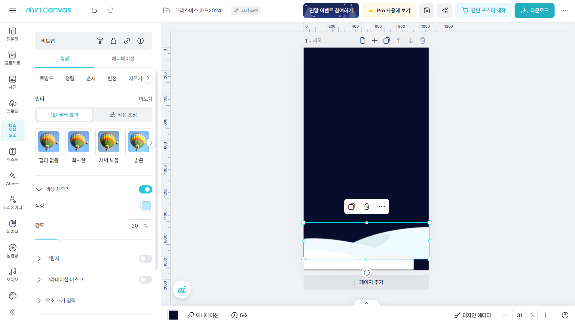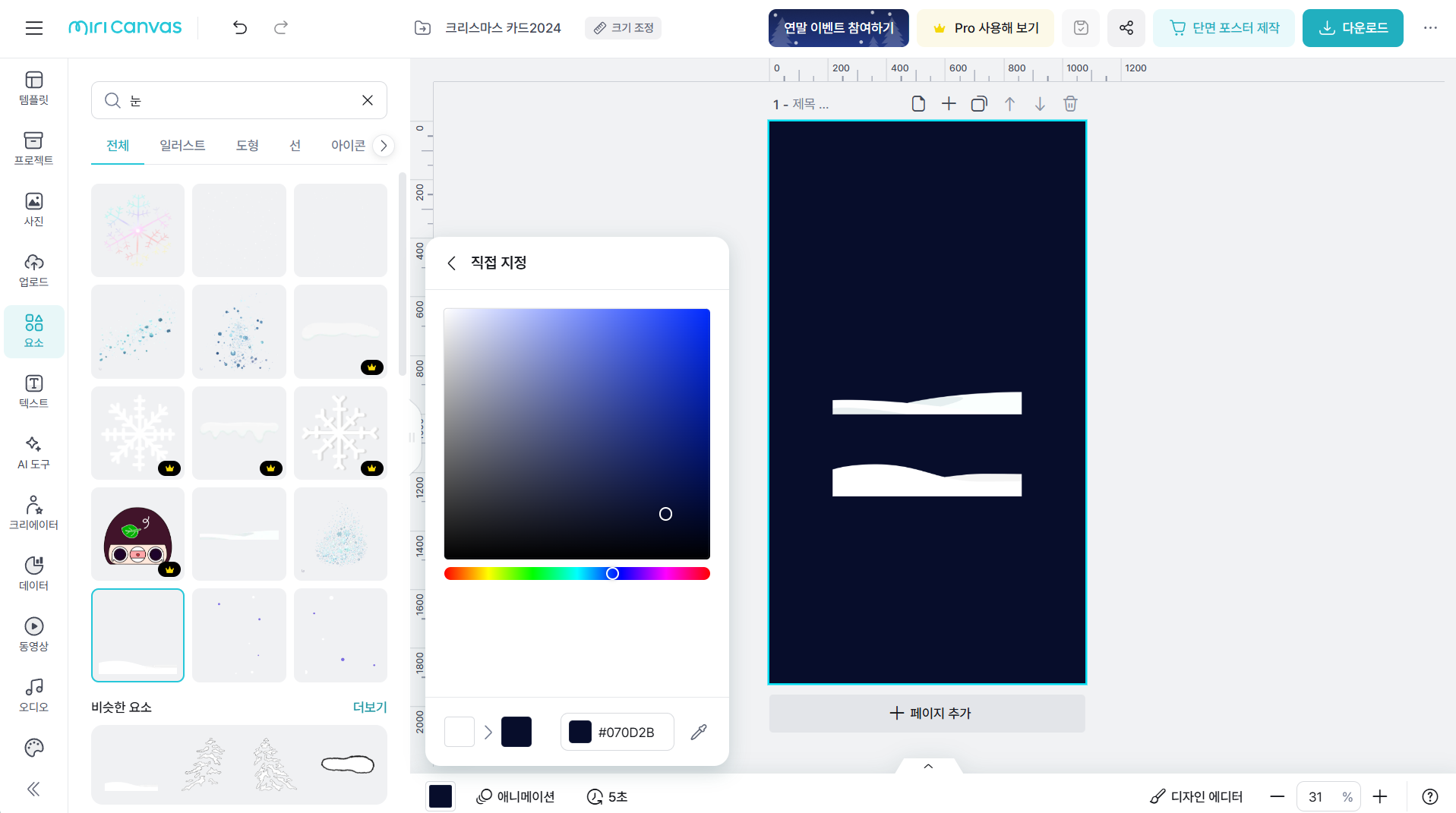 5.요소 메뉴를 선택하고 ‘눈’키워드를 입력하여 눈이 내려서 쌓인 모습의 요소를 두 개 선택하여 삽입하고 화면 하단에 배치합니다. 뒤쪽에 배치한 눈 요소를 선택하고 왼쪽 속성창에서 '색상 채우기'를 선택하여 연한 하늘색을 설정한 다음 강도를 20%로 설정합니다.
