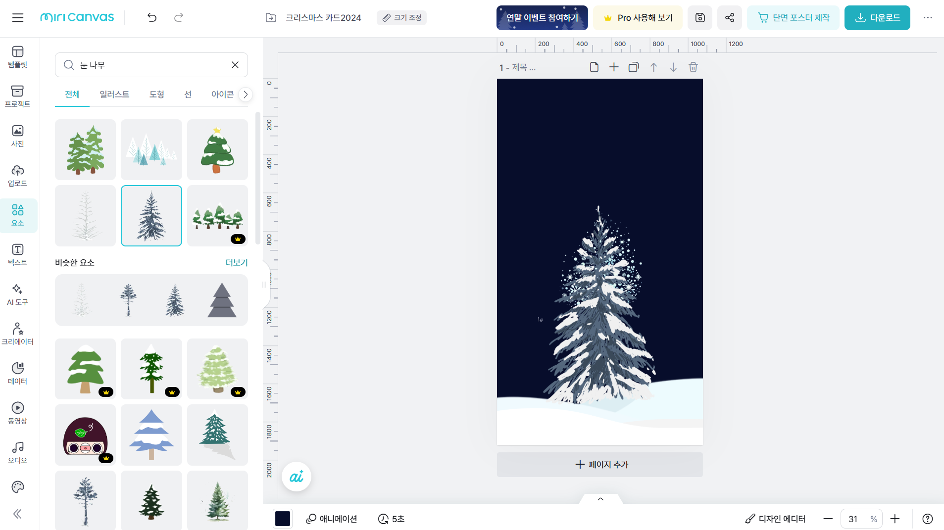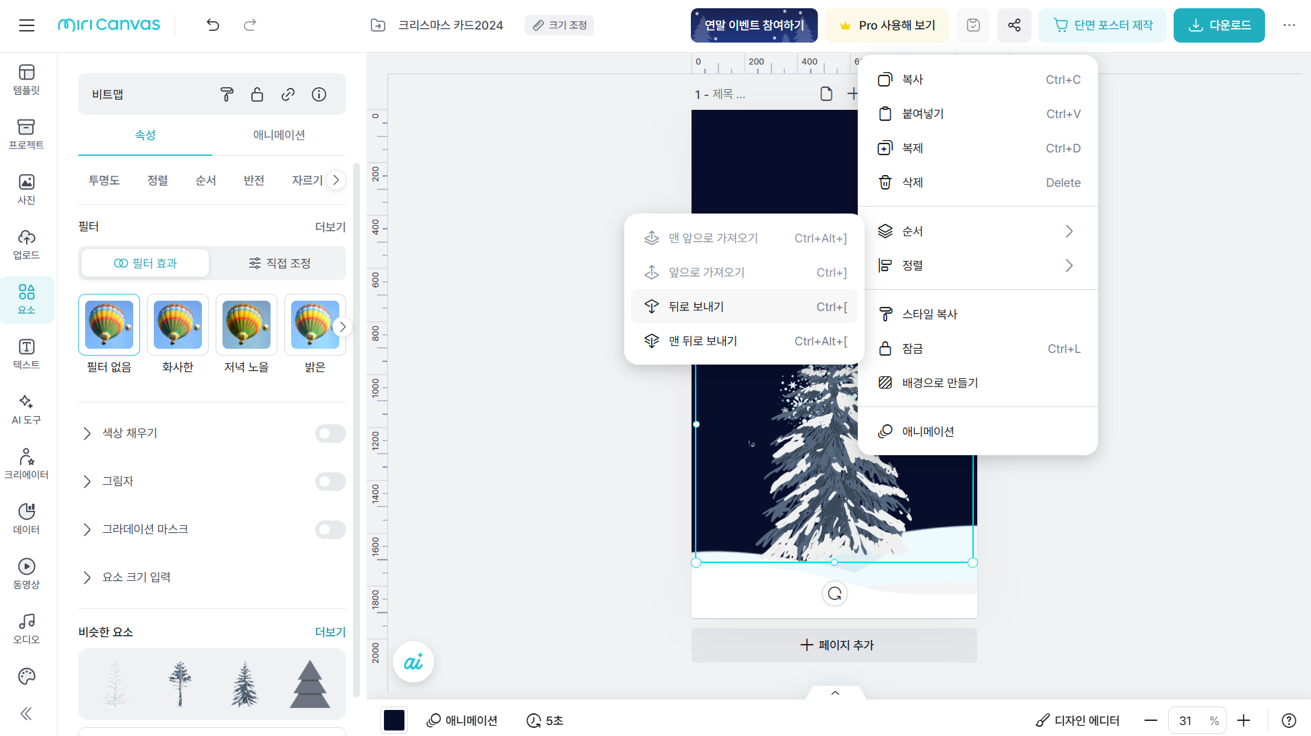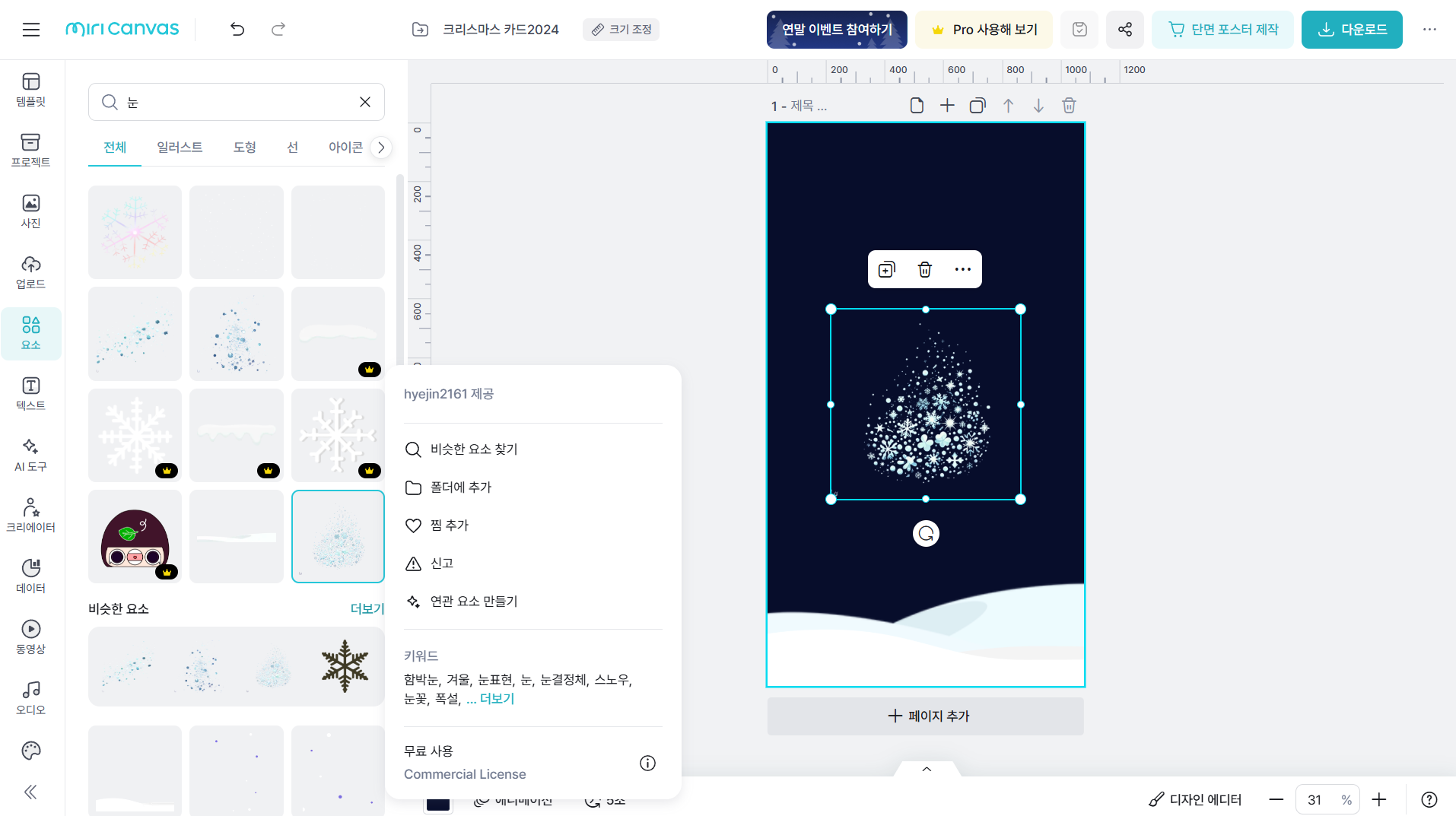 7.눈 키워드에 나무 키워드를 추가하여 입력하고 크기를 키워 배치합니다. 나무 요소를 선택하여 더 보기 메뉴를 클릭한 다음 순서 > 뒤로 보내기를 클릭하여 눈 결정 요소 뒤로 나무 요소를 보냅니다. 눈 결정 요소의 크기도 나무에 맞춰 키워줍니다.