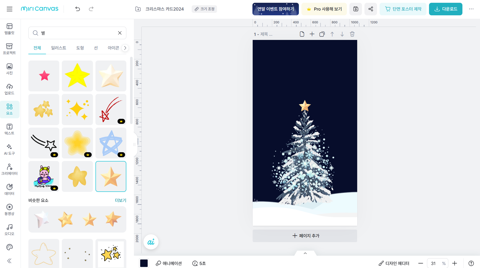 8.‘별’ 키워드를 입력하여 적당한 별 요소를 삽입하고 크기를 줄인 다음 나무 꼭대기에 배치합니다.