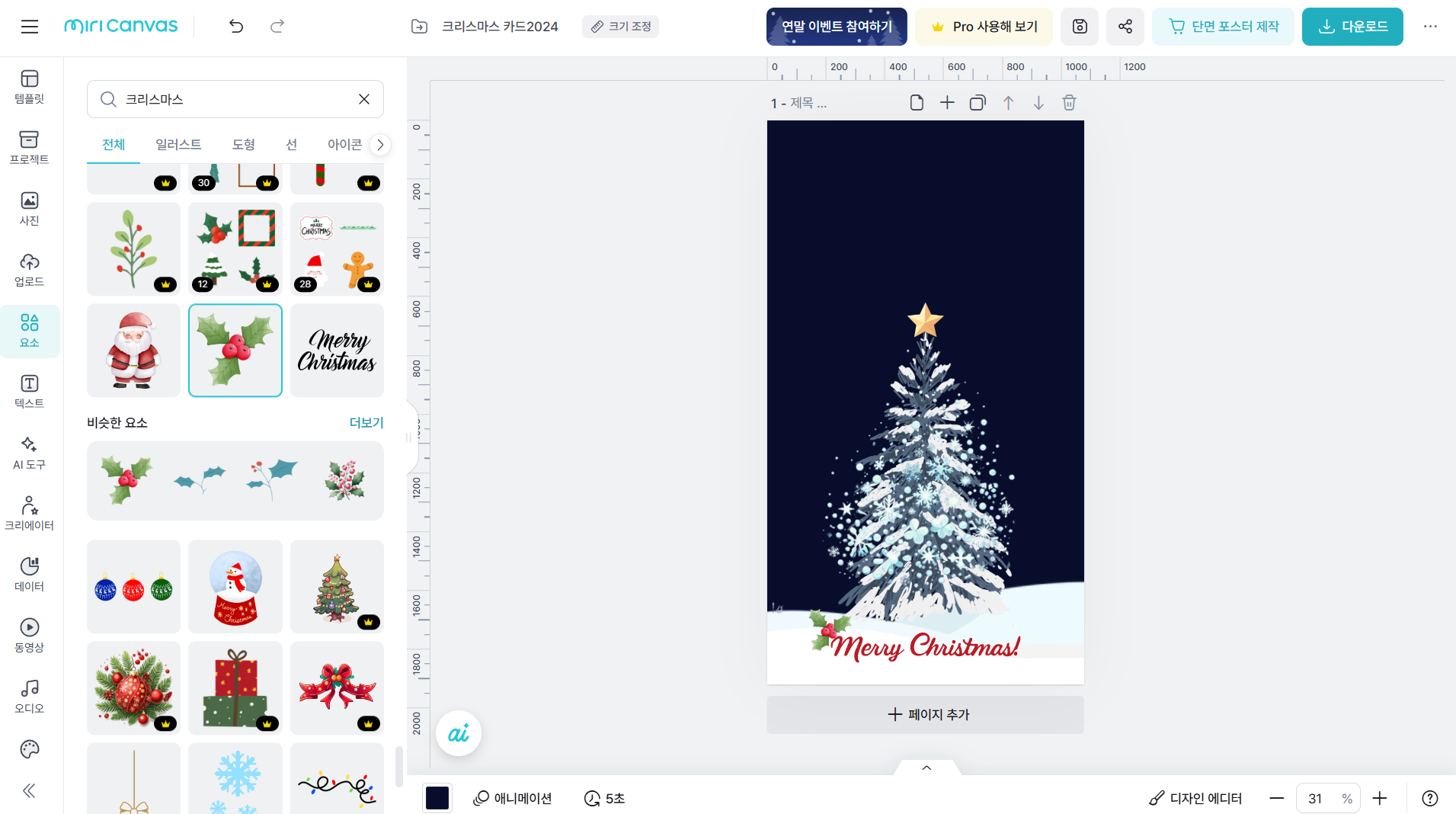 9.크리스마스 키워드를 입력하고 메리 크리스마스라고 써있는 텍스트 요소 중 적당한 것을 선택하여 삽입하고 배치합니다. 호랑가시 나무 잎사귀 요소도 찾아서 배치하고 크기를 조정합니다.
