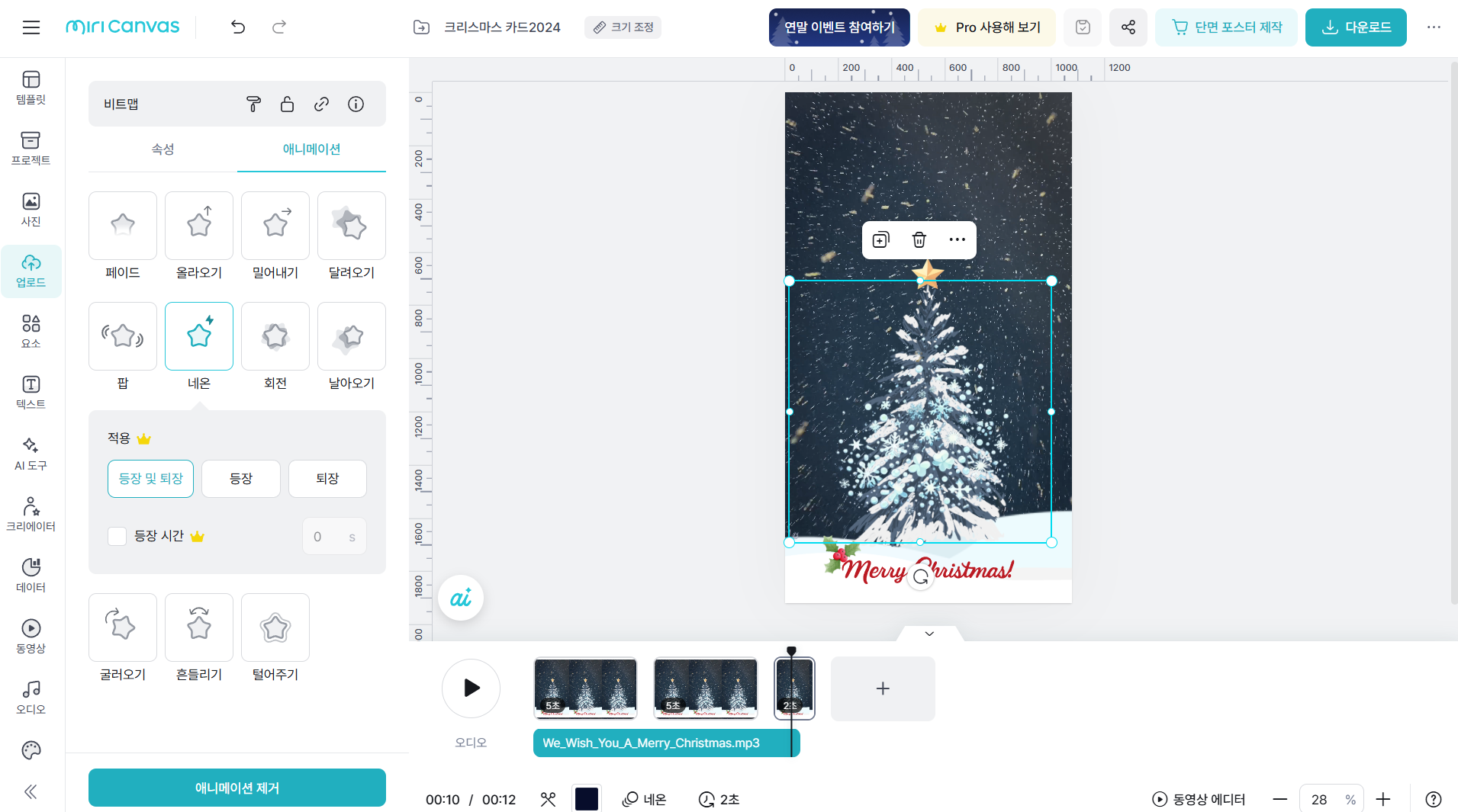 15.마지막 페이지로 플레이 헤드를 옮기고 나무 위에 올려진 눈송이 요소를 선택한 다음 속성창에서 ‘애니메이션’ 탭을 눌러 ‘네온’ 효과를 적용합니다.