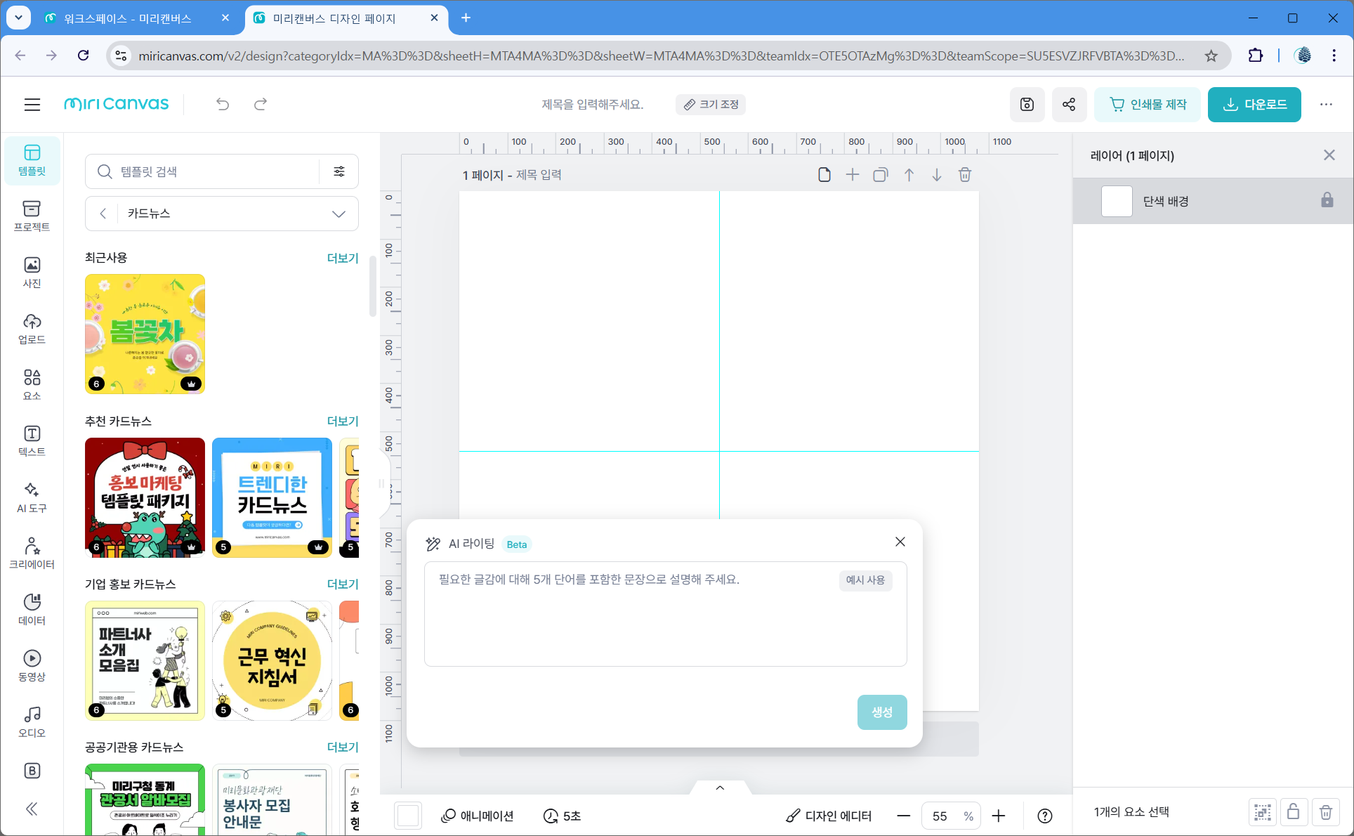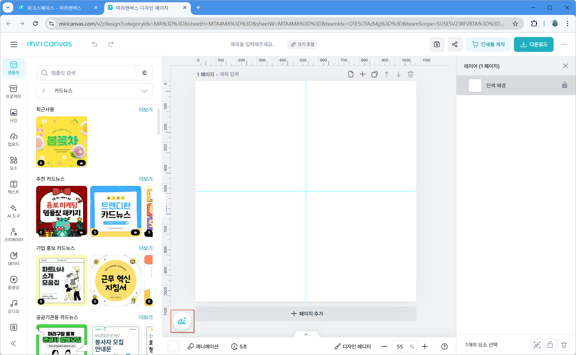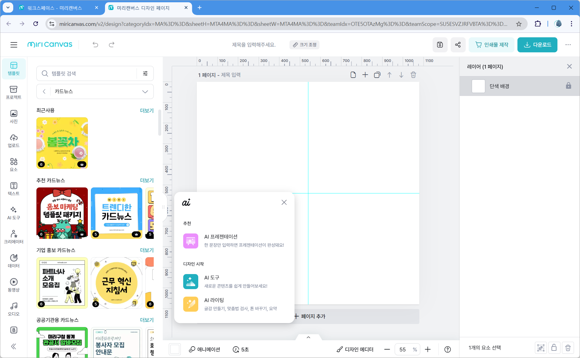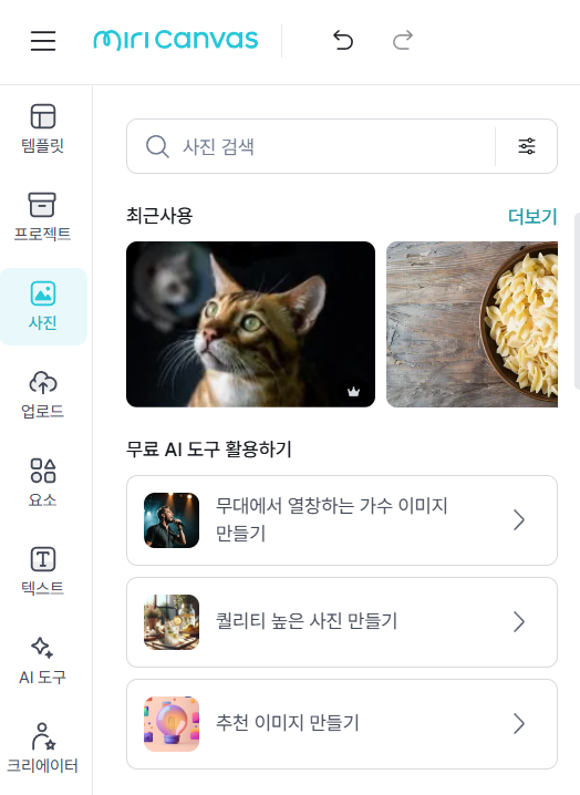에디터 창 왼쪽 아래에는 AI 아이콘이 있습니다. 이 아이콘을 누르면 현재 제공되는 AI기능으로 바로 연결되는 버튼이 나타납니다. 이 버튼을 누르면 미리캔버스가 제공하는 AI기능을 모아서 보여주는 창이 나타납니다.