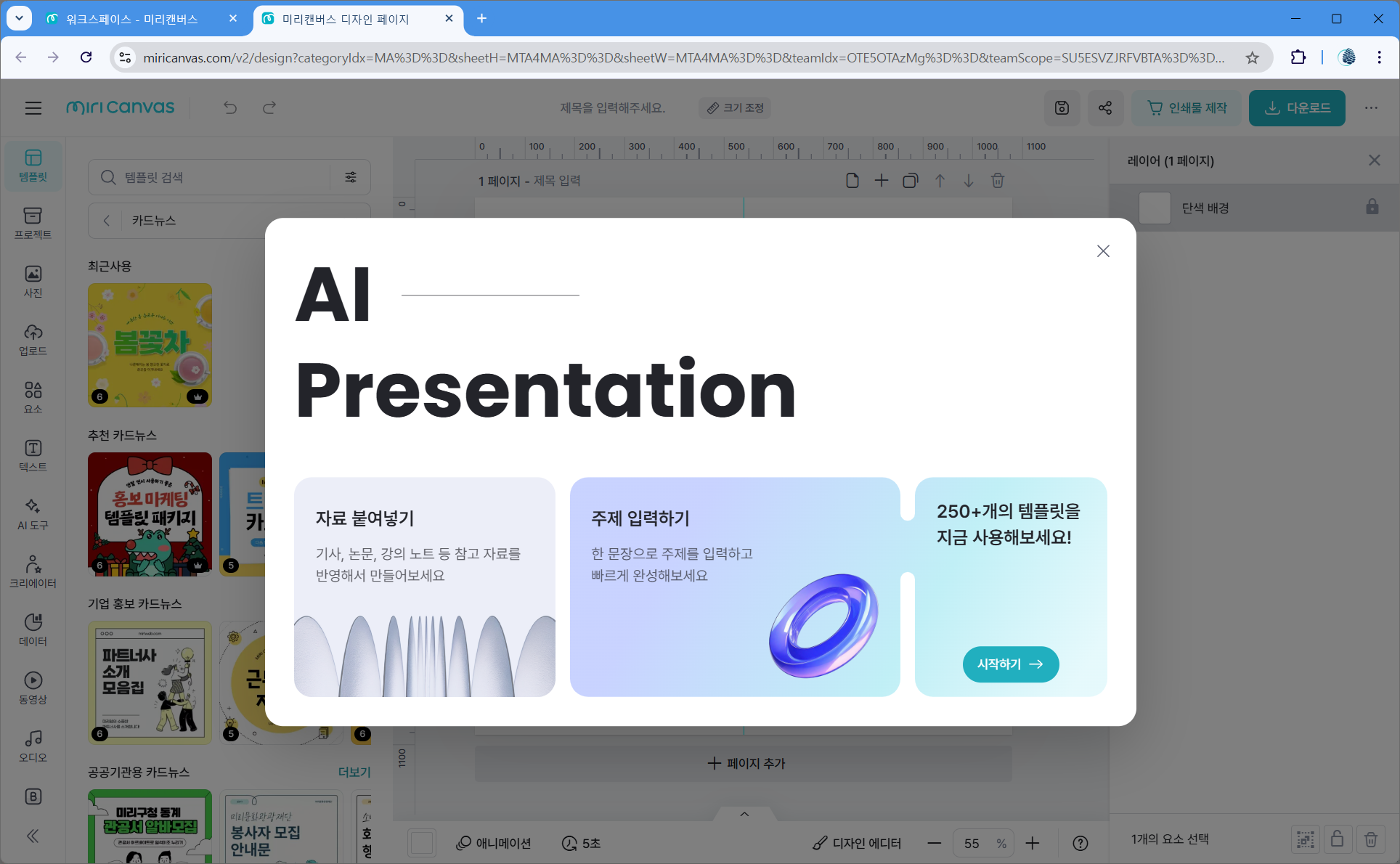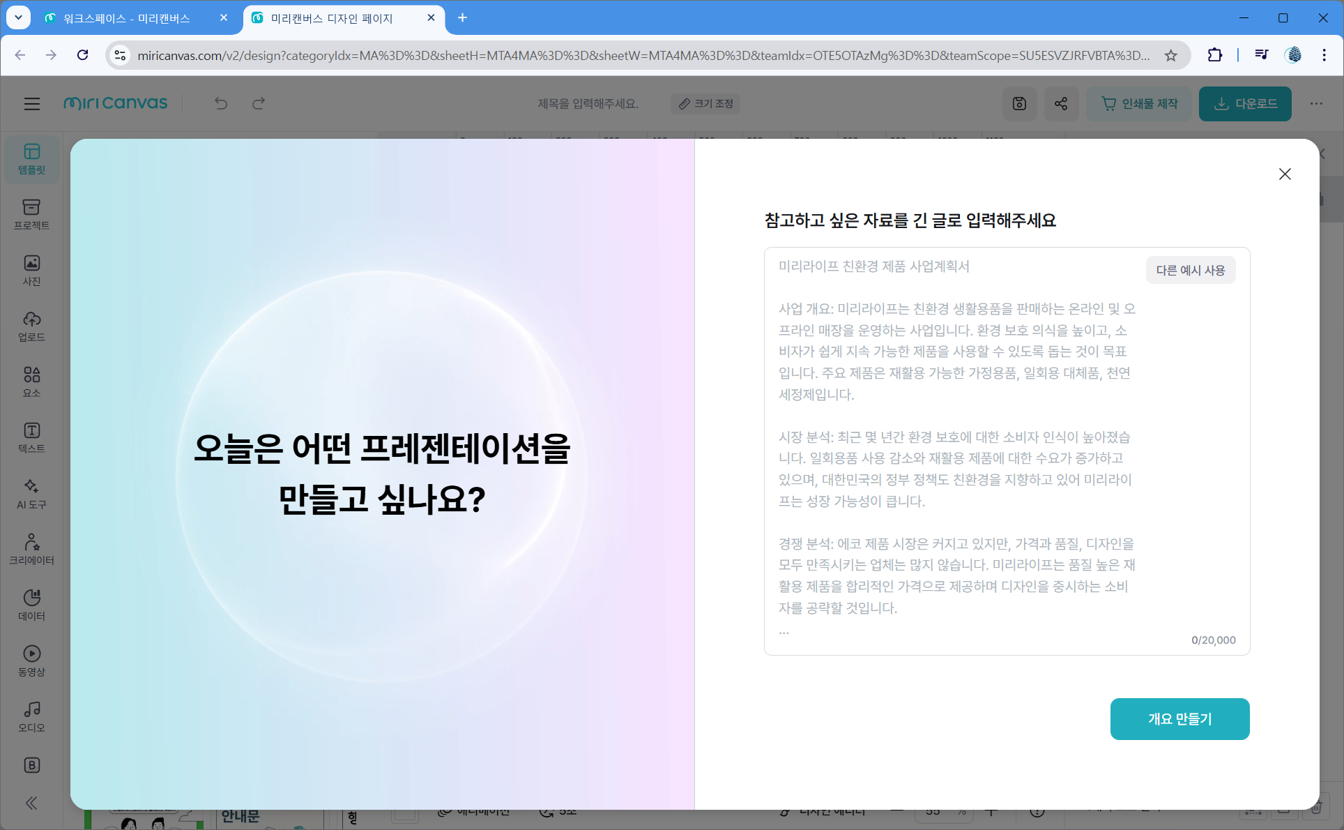 AI 아이콘을 눌러서 나타나는 AI 팝업창에서 'AI 프레젠테이션'을 클릭하거나 '새 디자인 만들기' 버튼을 눌러서 'AI 프레젠테이션 만들기'를 선택하면, 프레젠테이션으로 만들고 싶은 주제를 입력할 수 있는 팝업창이 나타납니다. 원하는 주제를 입력하면 자동으로 '개요 만들기' 가 진행됩니다.