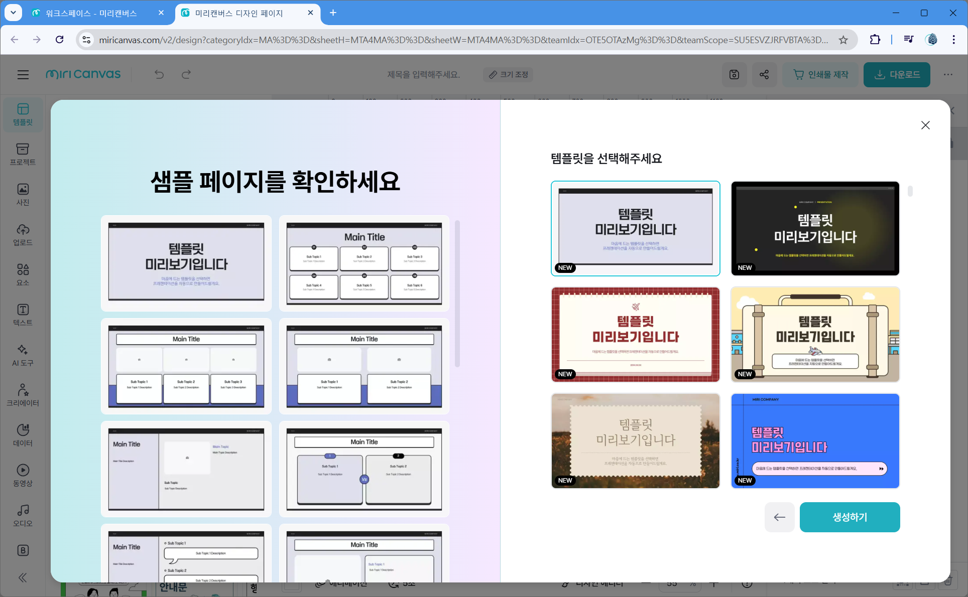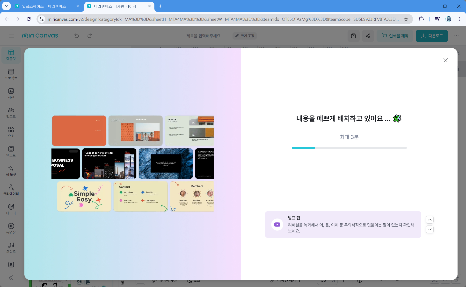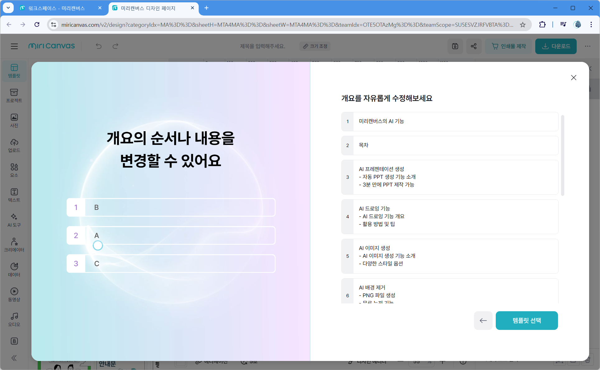 생성된 개요는 직접 순서와 내용을 편집할 수 있습니다. 마지막에 '템플릿 선택' 버튼을 누르 프레젠테이션에 적용할 디자인 템플릿을 선택합니다. 템플릿까지 선택하면 프레젠테이션이 생성되는데, 생성까지 최대 3분의 시간이 걸릴 수 있습니다.