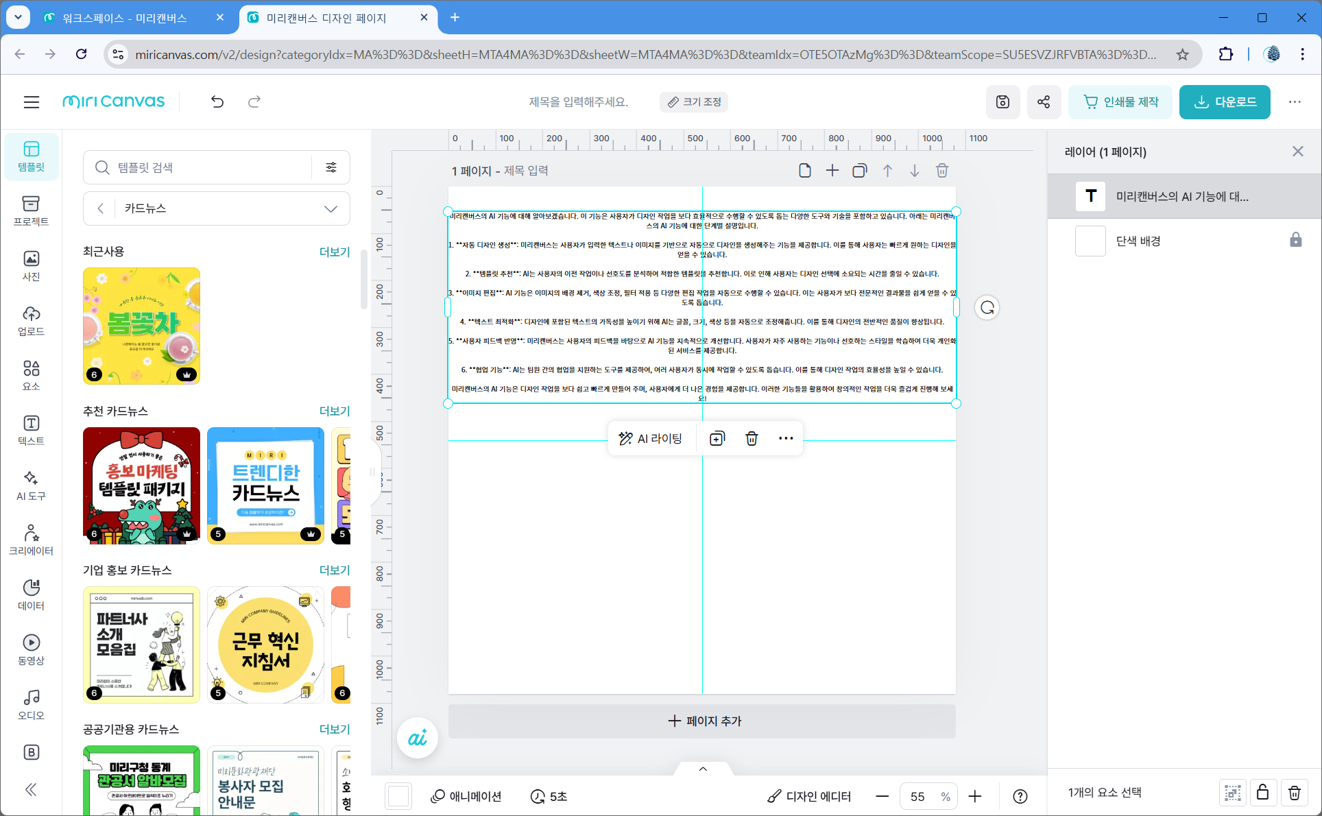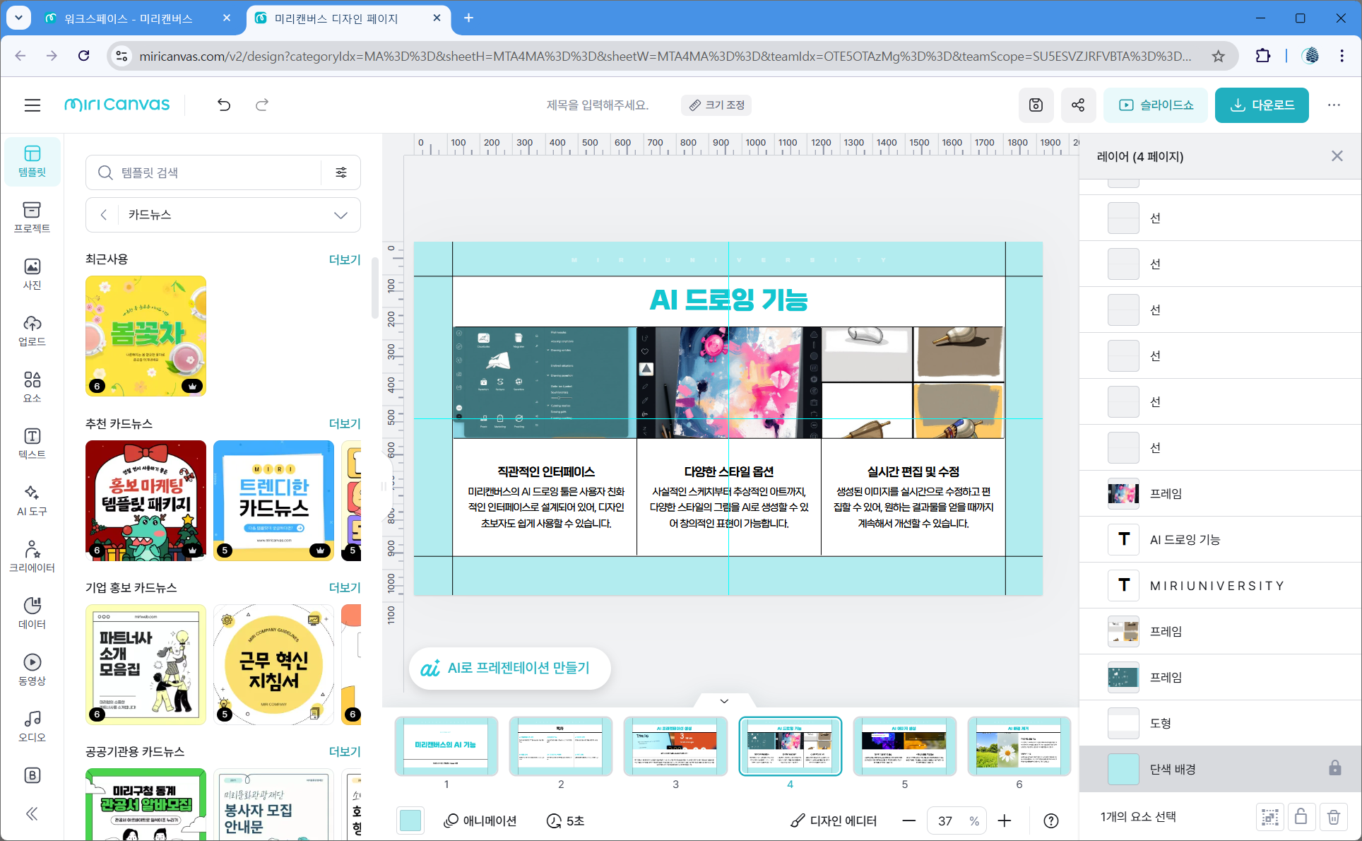 미리캔버스가 작년부터 시작한 2.0 업그레이드를 완료하면서 AI기능이 대폭 보강되었습니다. 미리캔버스의 AI기능은 가장 최근에 AI프레젠테이션 기능이 발표되면서 AI프레젠테이션, 이미지 생성, 문장 생성의 세가지 기능으로 나뉘게 되었습니다.