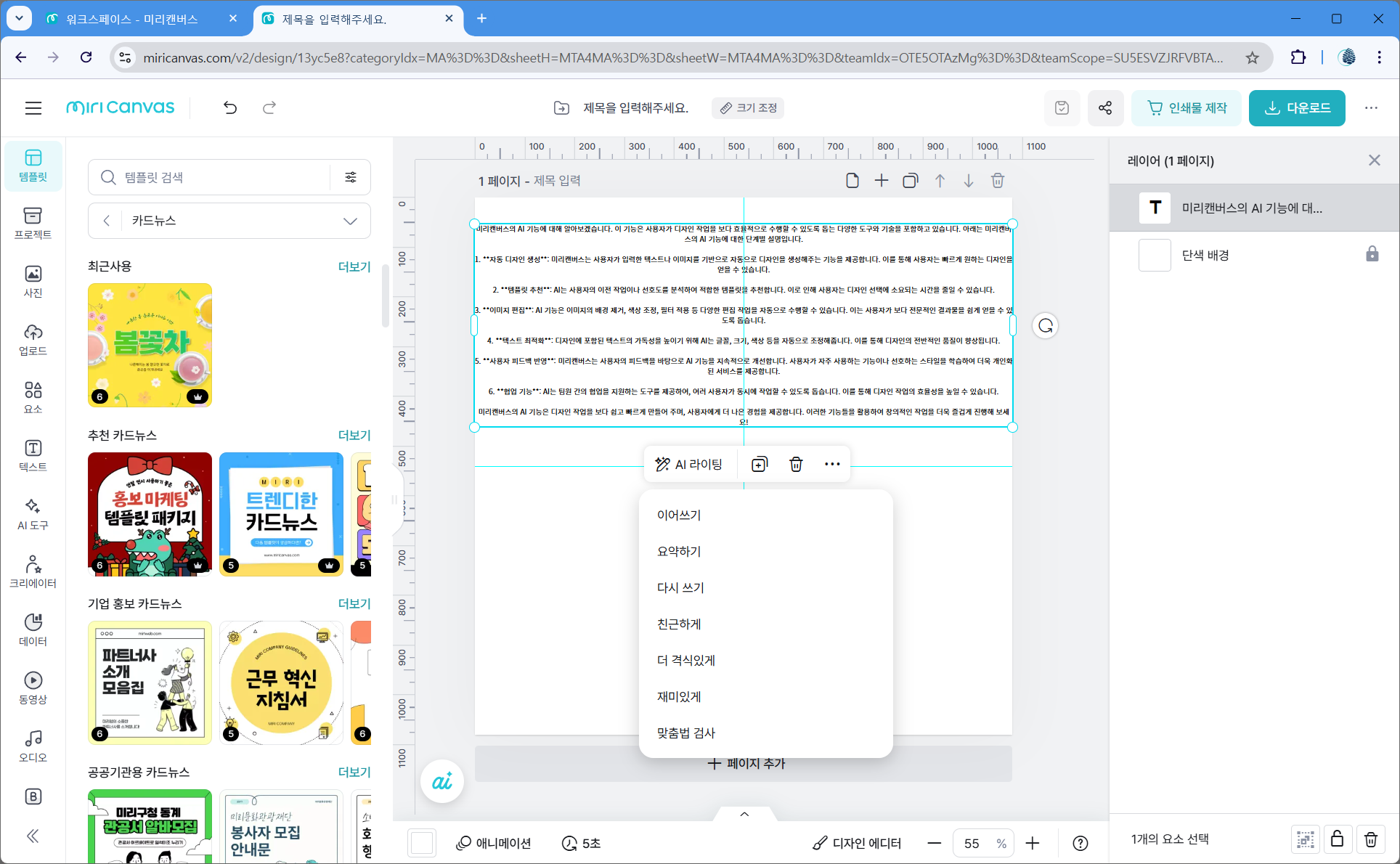 AI 팝업창에서 ‘AI 라이팅’ 기능을 클릭하면, 간단한 문장을 입력하여 원하는 글감을 생성할 수 있습니다. 생성된 글감을 확인 후, AI 라이팅 기능으로 원하는 느낌으로 내용을 추가하거나 변경한 다음, 마무리로 맞춤법 검사도 적용할 수 있습니다.