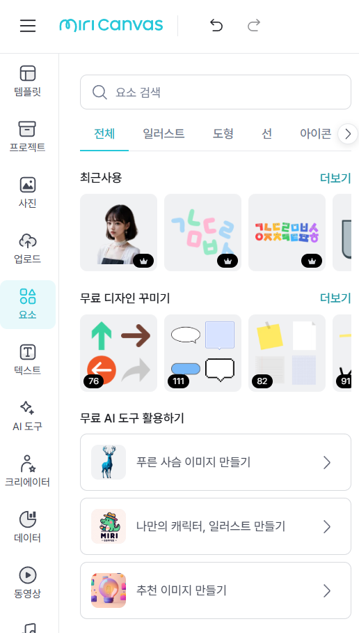 이 기능은 디자인 요소별로 스타일이 분리되어 사진 요소 메뉴에서는 사진처럼 이미지를 생성해주고 요소 메뉴에서는 일러스트 요소처럼 이미지를 생성해주도록 퀵 링크가 들어 있습니다.