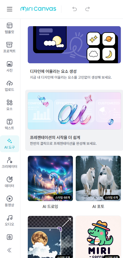 왼쪽 메뉴에서 ‘AI도구’ 메뉴를 누르거나, AI 팝업창에서 ‘AI 도구’ 메뉴를 클릭하면 에디터 좌측의 ‘AI 도구’ 메뉴가 활성화되면서 미리캔버스의 AI 기능을 모아서 볼 수 있습니다. 앞에서 살펴본 'AI 프레젠테이션'을 비롯하여 이미지 생성 기능 기능으로는 '디자인에 어울리는 요소 생성' 기능 부터 'AI 드로잉', 'AI 포토', '이미지 확장', '로고 만들기', '비슷한 이미지 생성', '캐리커쳐 만들기', '배경 만들기', '명화 따라 그리기', '캐릭터 만들기', '흑백 컬러복원' 등 입니다.