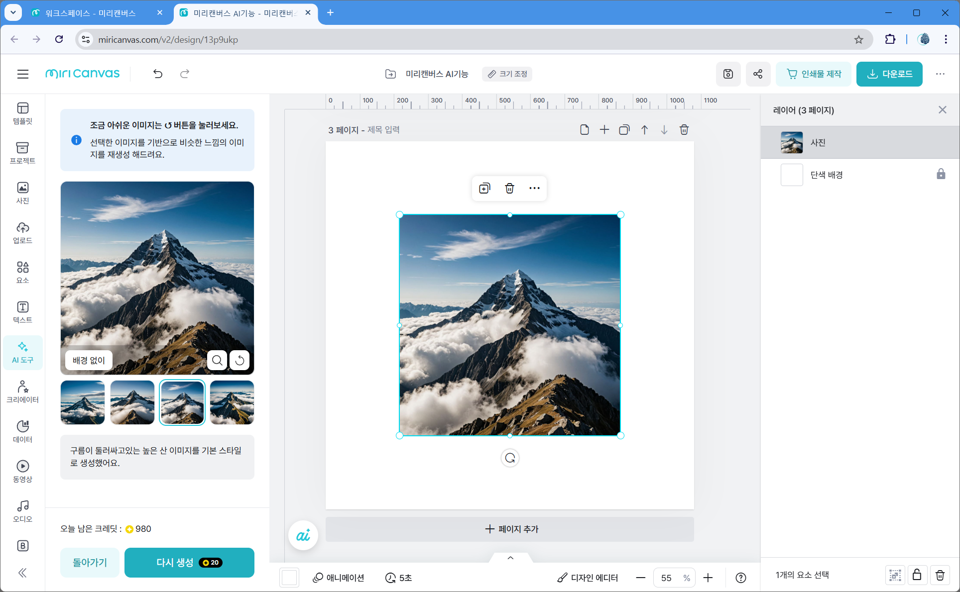 목록에서 원하는 항목을 선택하고, 스타일과 원하는 이미지에 대한 설명을 입력하여 이미지를 생성합니다. 이미지가 생성되면 왼쪽 목록에 썸네일로 나타나는데, 이 중 사용할 이미지를 클릭하여 편집 영역에 배치할 수 있습니다. 한번 생성한 이미지는 다음에 또 사용할 수 있도록 ‘업로드’ 메뉴에도 추가됩니다.