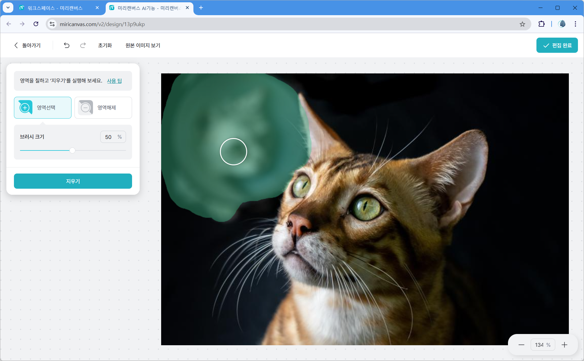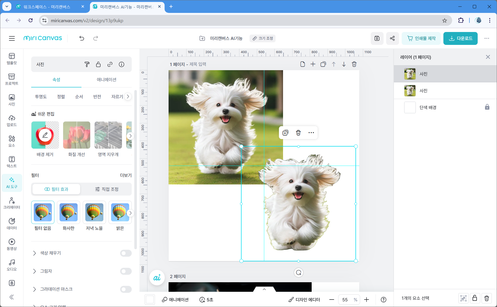 사진 요소를 편집 영역에 삽입하면 왼쪽 속성창에 'AI 쉬운 편집' 옵션이 나타납니다. 이 옵션들은 '배경 제거', '화질 개선', '영역 지우개', '부분 생성' 기능입니다. 말 그대로 특정 이미지의 배경을 제거하거나 화질을 개선하고, 이미지의 일부분을 지우거나 부분적으로 이미지를 생성하는 기능들 입니다.