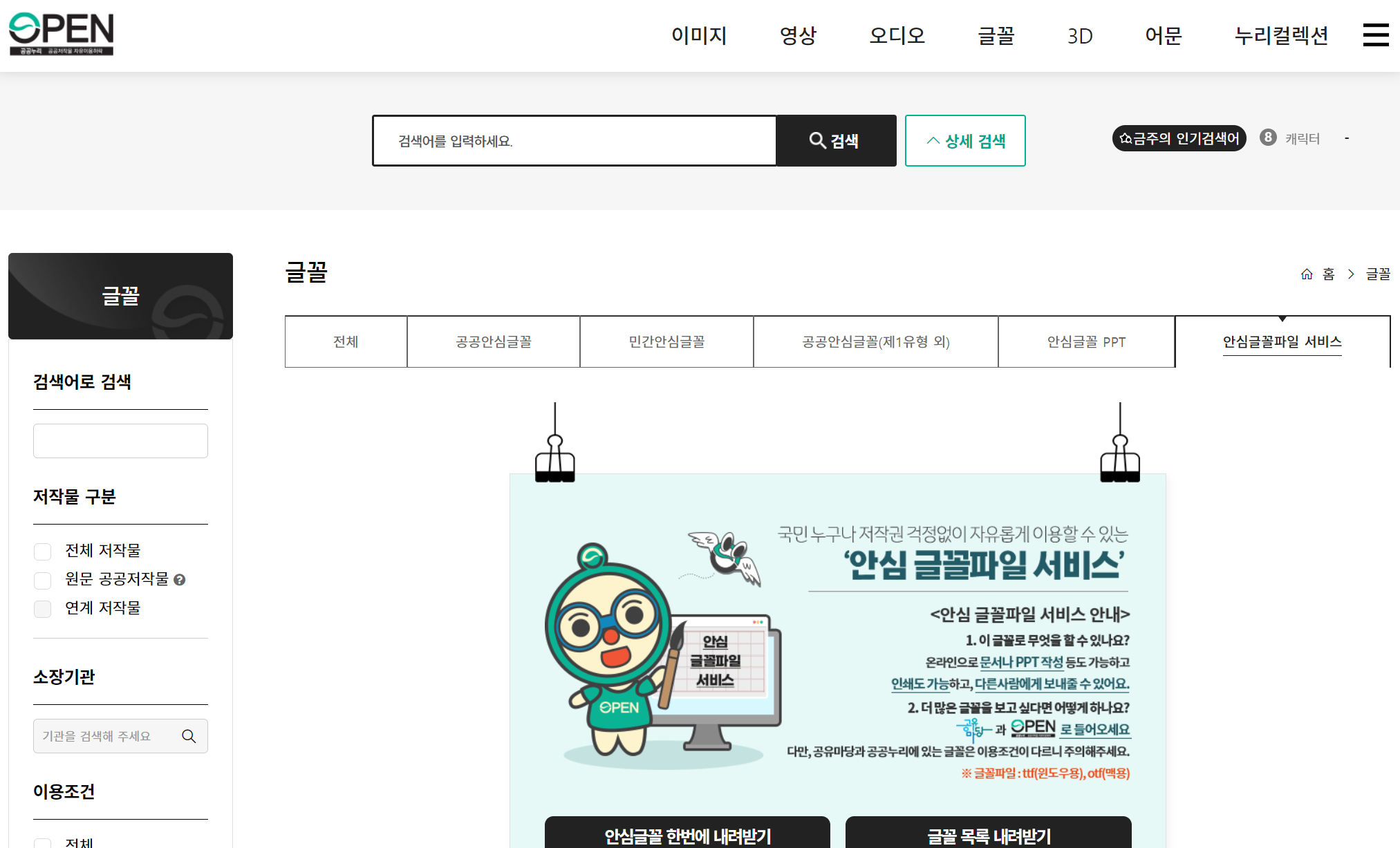 한국 저작권 위원회가 운영하는 공유마당 사이트와 문화체육관광부 산하 한국문화정보원이 운영하는 공공누리 사이트에서 안심글꼴을 제공하고 있습니다.