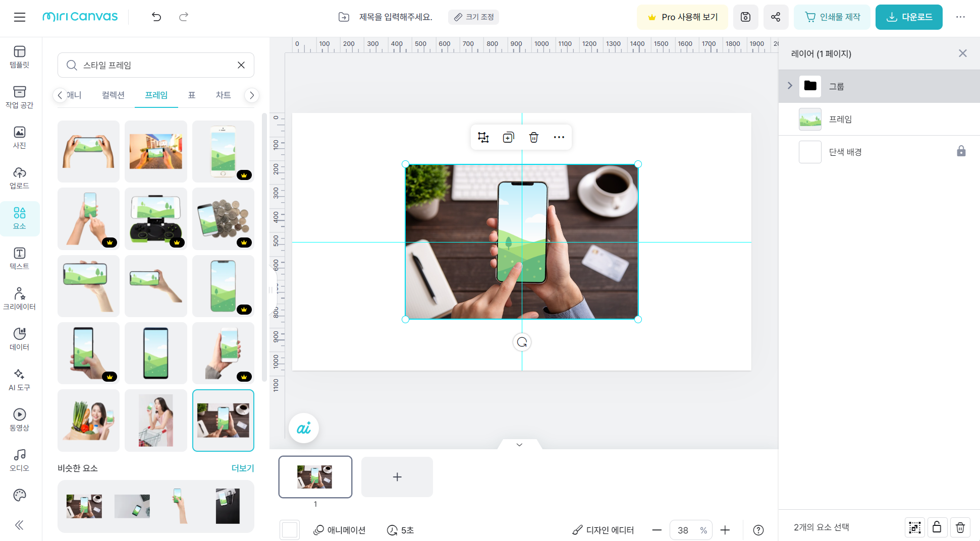 미리캔버스는 사용자가 쉽게 디자인을 만들 수 있도록 다양한 템플릿을 제공하는 온라인 디자인 플랫폼입니다. 미리캔버스의 요소 중 프레임은 이미지의 위치와 크기를 쉽게 조절할 수 있게 해주며, 초보자도 손쉽게 이미지를 배치하고 조정할 수 있도록 도와줍니다. 프레임 요소는 불규칙도형 프레임, 기본 프레임, 분할 프레임, 스타일 프레임, 말풍선 프레임 등을 포함한 다양한 종류가 제공됩니다. 이 중에 스타일 프레임이나, 목업 프레임들은 미리캔버스 내부에서 디자인 작업 중에 목업을 사용할 수 있으므로 이미지뿐만 아니라 텍스트를 추가하여 디자인에 메시지를 더하거나, 자연스럽게 배치하여 디자인을 완성하는 데에도 사용될 수 있습니다.