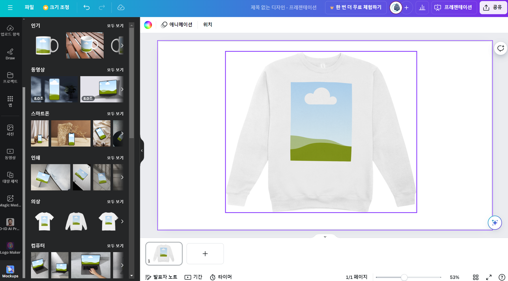 Canva는 미리캔버스와 마찬가지로 사용자가 전문적인 디자인을 쉽게 만들 수 있도록 다양한 템플릿을 제공하는 온라인 그래픽 디자인 플랫폼입니다. 목업 앱을 별도로 제공하여 웹사이트, 티셔츠, 책, 휴대폰 등 다양한 제품의 목업을 만들 수 있으며, 이를 통해 제품이 실제 환경에서 어떻게 보일지를 시각화할 수 있습니다. Canva는 직관적인 편집 도구와 방대한 디자인 요소 라이브러리를 제공하여 사용자가 손쉽게 목업을 수정하고 맞춤화할 수 있도록 지원합니다. Canva의 목업 기능은 캔바 내에서 디자인 작업물에 목업을 삽입하여 마케팅 자료, 브랜드 프로모션, 소셜 미디어 게시물 등 다양한 용도로 활용될 수 있으며, 사용자는 완성된 목업을 고품질의 이미지 파일로 저장하거나 공유할 수 있습니다.