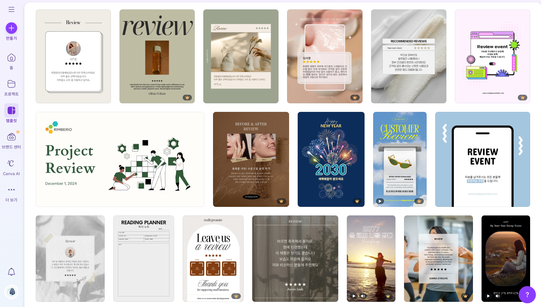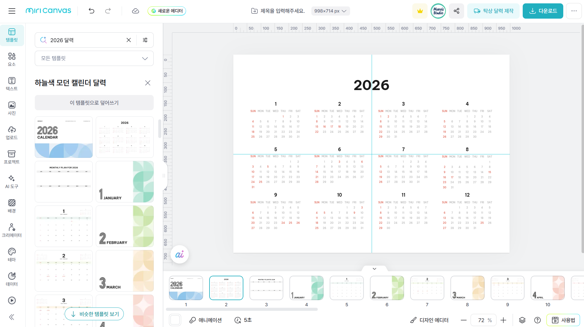 - 미리캔버스: 연간/월간/주간 형식 다양, 한국 공휴일 자동 반영으로 실용성 최고