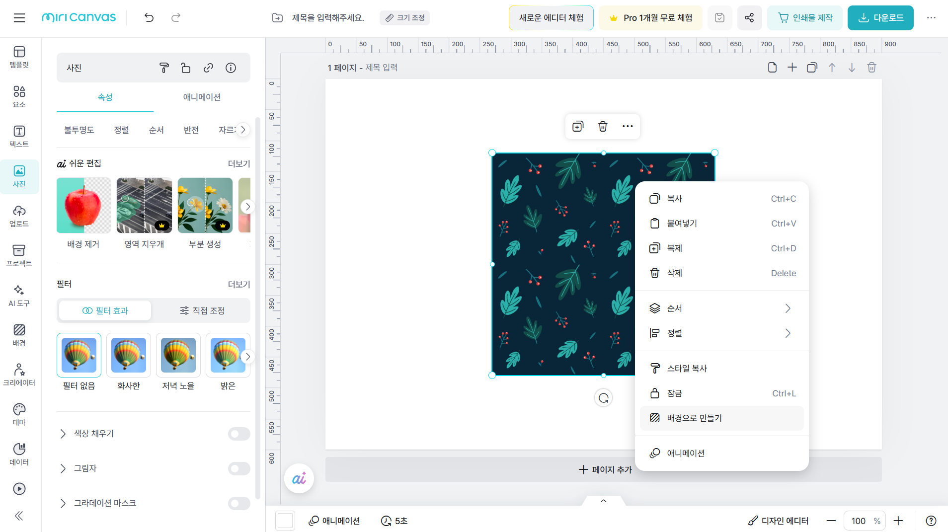 미리캔버스에서는 '요소', '사진', '배경' 탭에서 모두 '패턴'을 검색하여 다양한 패턴을 찾아 사용할 수 있습니다. '배경' 탭에서 선택한 패턴하면 바로 배경으로 적용되며 '요소', '사진'에서 선택한 패턴은 클릭하거나 드래그 앤 드롭으로 쉽게 배치할 수 있습니다. '사진' 탭에서 선택하여 작업 화면에 배치된 패턴 이미지는 우클릭을 통해 '배경으로 만들기'를 선택하면 배경 패턴으로 활용할 수 있습니다. 패턴의 색상 변경이나 투명도 조절도 왼쪽 속성 패널에서 간단하게 적용할 수 있습니다.
