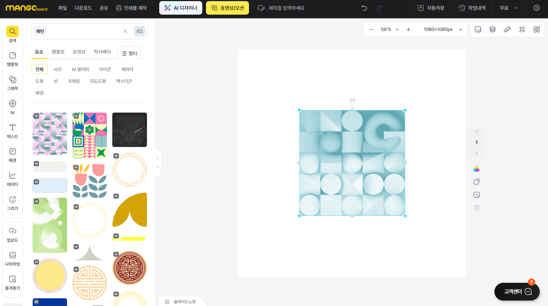 망고보드에서는 왼쪽 메뉴의 '검색' 탭에서 '패턴'을 검색하면 요소, 템플릿, 동영상, 픽사베이 탭에서 다양한 패턴 소재를 찾을 수 있습니다. '배경' 탭에서 패턴 배경을 선택하면 바로 배경에 적용됩니다. 패턴을 추가한 후에는 왼쪽 편집창에서 크기, 위치, 투명도를 자유롭게 조절할 수 있습니다.