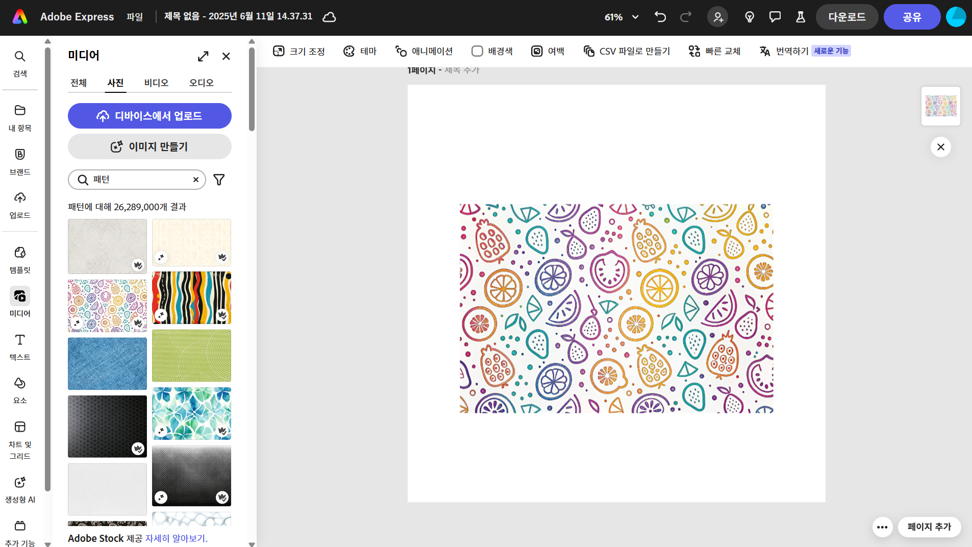 어도비 익스프레스에서는 '미디어', '요소' 탭에서 '패턴'으로 검색하면 다양한 패턴을 찾아 사용할 수 있습니다. 선택한 패턴은 화면에서 직접 크기와 위치를 조정할 수 있으며, 왼쪽 속성 패널에서 색상 변경, 투명도 조절, 블렌딩 모드 변경 등의 고급 편집이 가능합니다. '요소'탭의 '배경' 항목에서 '패턴' 키워드로 검색하여 패턴을 선택하면 바로 배경 이미지로 적용됩니다.