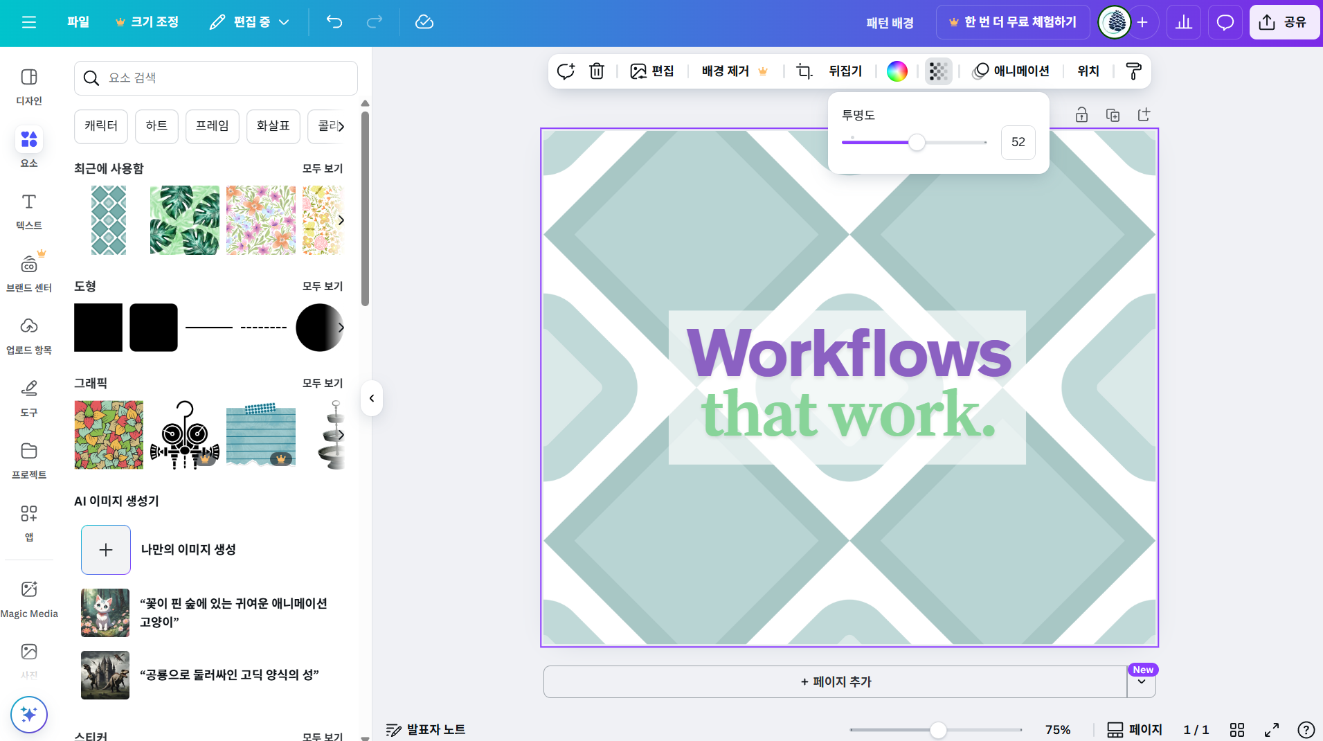 캔바에서는 '요소' 메뉴에서 '그래픽' 섹션을 통해 다양한 패턴을 찾을 수 있습니다. 검색창에 'pattern'이나 '패턴'을 입력하면 수많은 패턴 옵션이 나타납니다. 패턴을 선택한 후 색상을 변경하거나 크기를 조절할 수 있으며, 투명도 설정을 통해 배경으로 활용하기에 적합하게 만들 수 있습니다. 외부에서 다운로드한 패턴 이미지는 '업로드' 기능을 통해 가져와 사용할 수 있습니다.